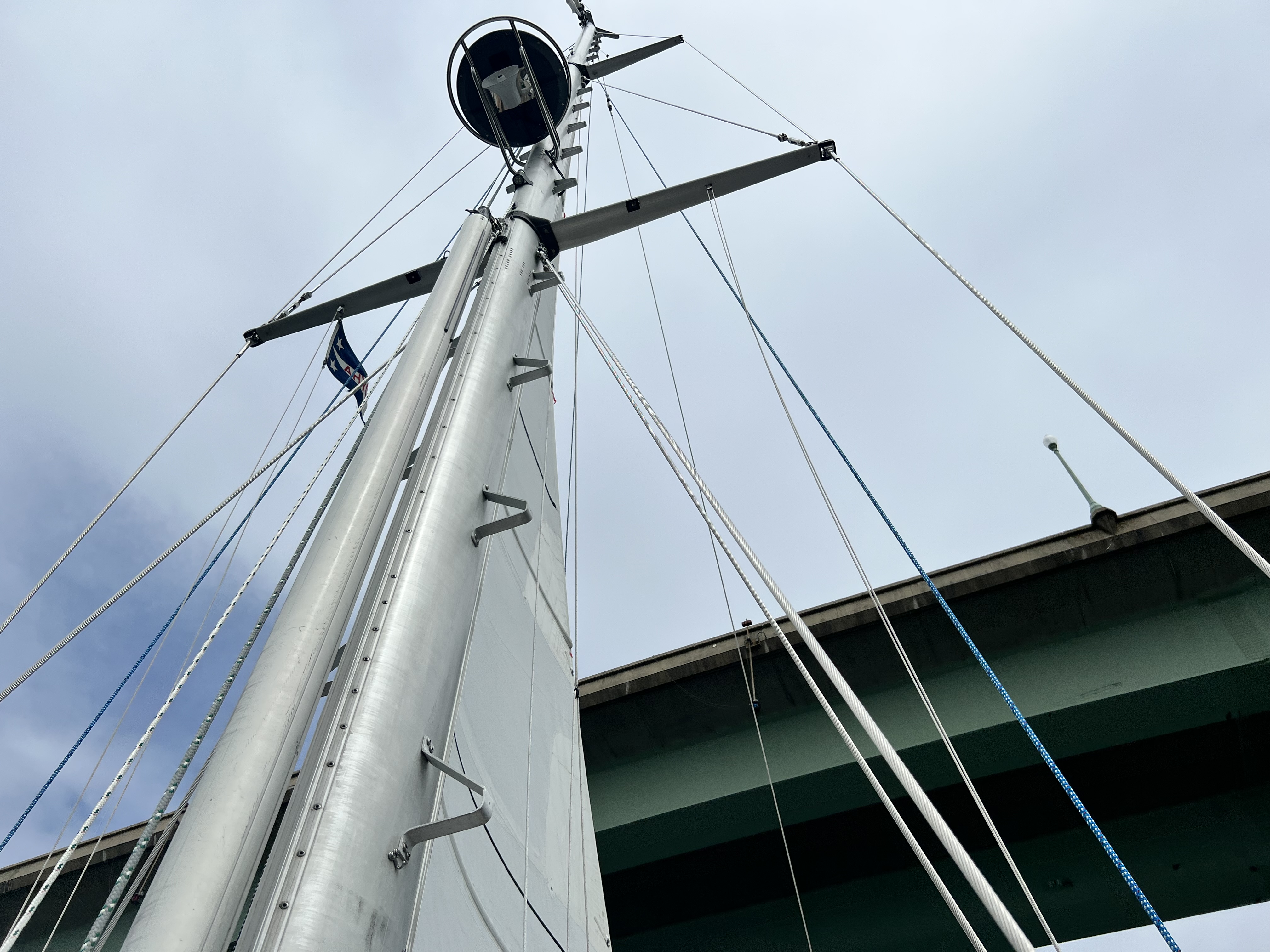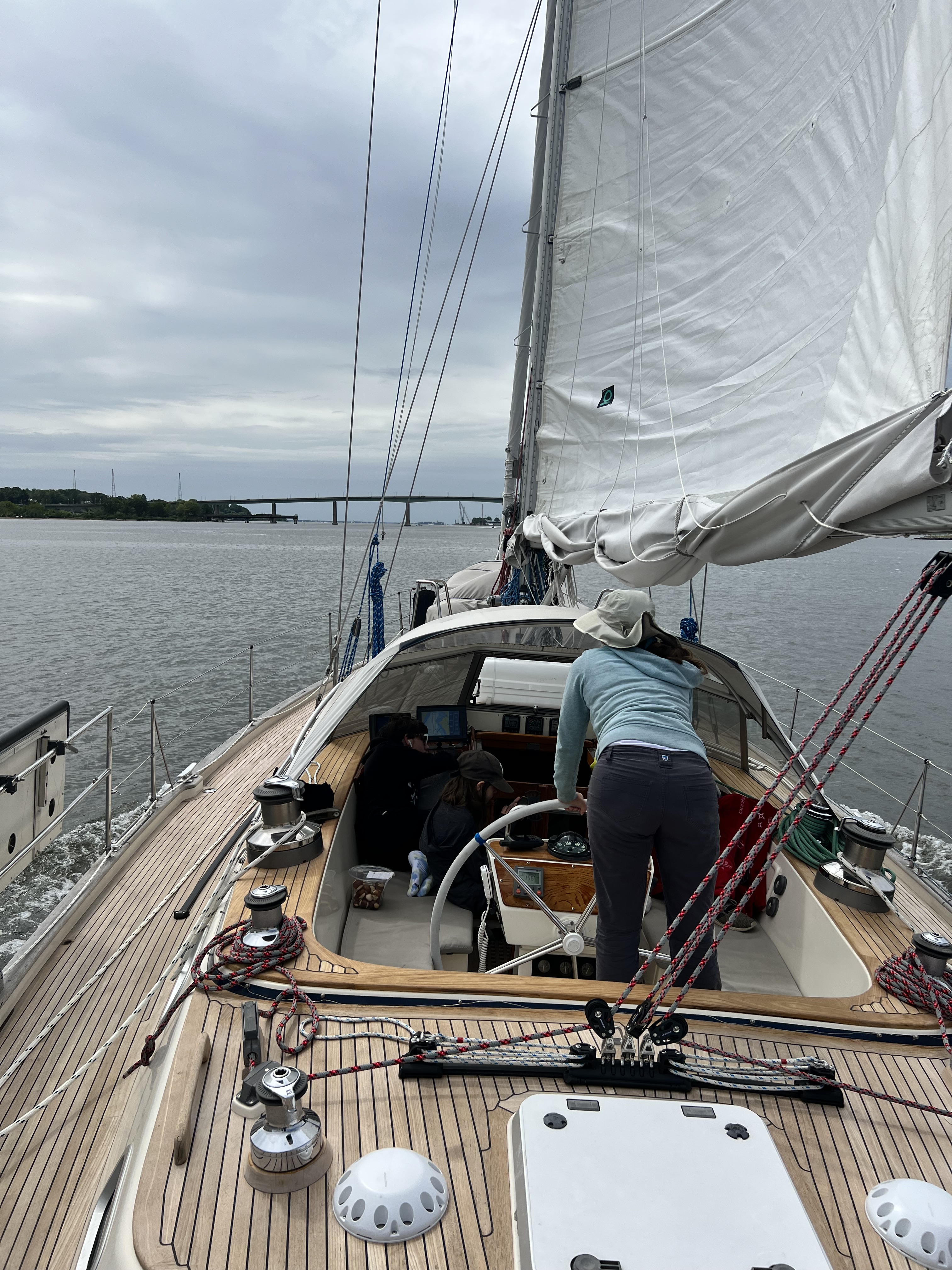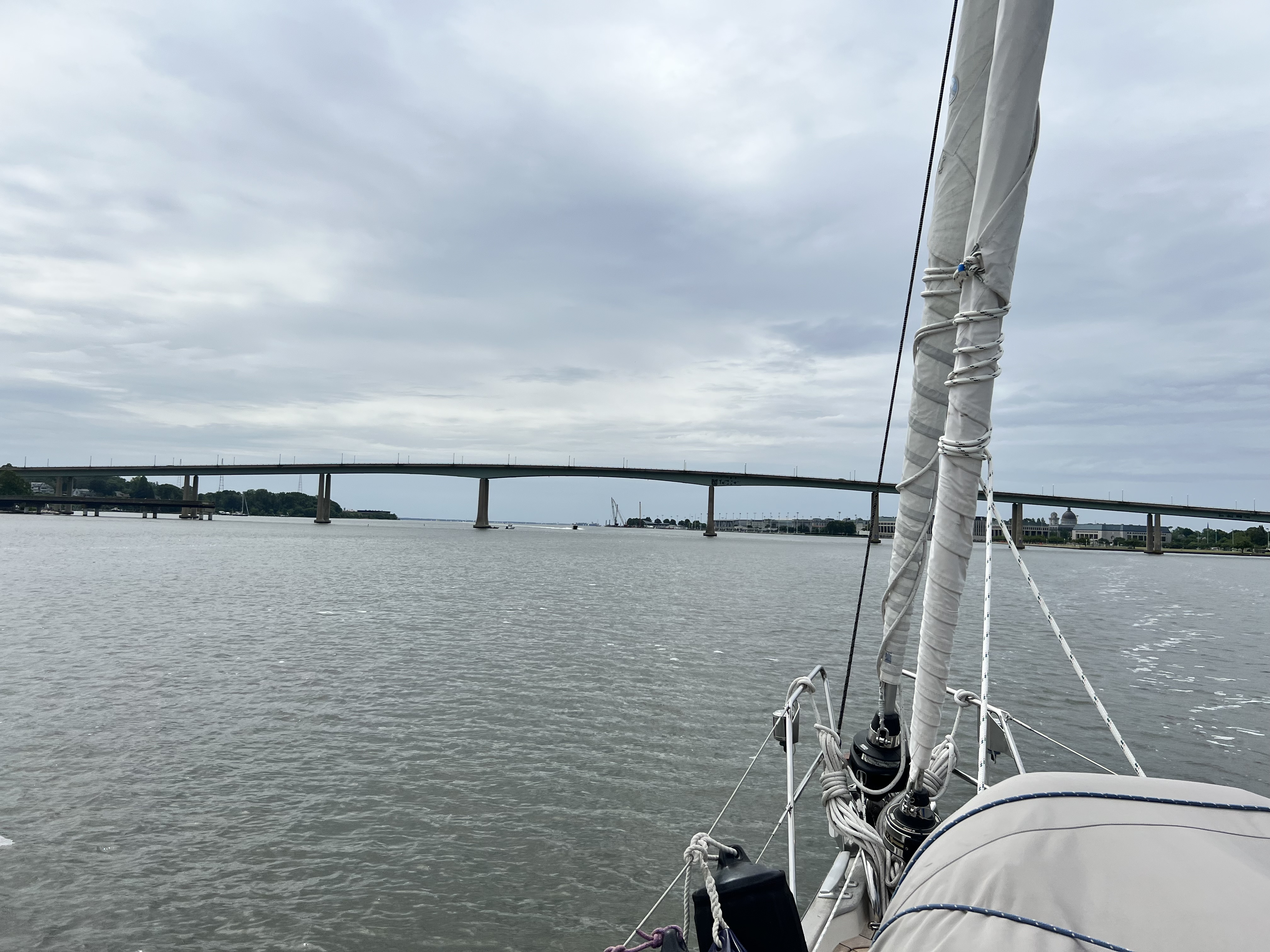 Our first trip up the Severn river was fun even though there was not much wind. We cleared the bridges by several feet, but it seemed close to me. I couldn’t pay much attention to this as I discovered an issue with our new Selden Genoa furler which caused the furling line to wrap around the forestay below the drum. The entire drum was loose. The Rigging Company fixed the problem afterwards (thanks guys!), but it was a bit tense on the foredeck with the Genoa unfurled and no way to quickly furl it if we had to for safety reasons.