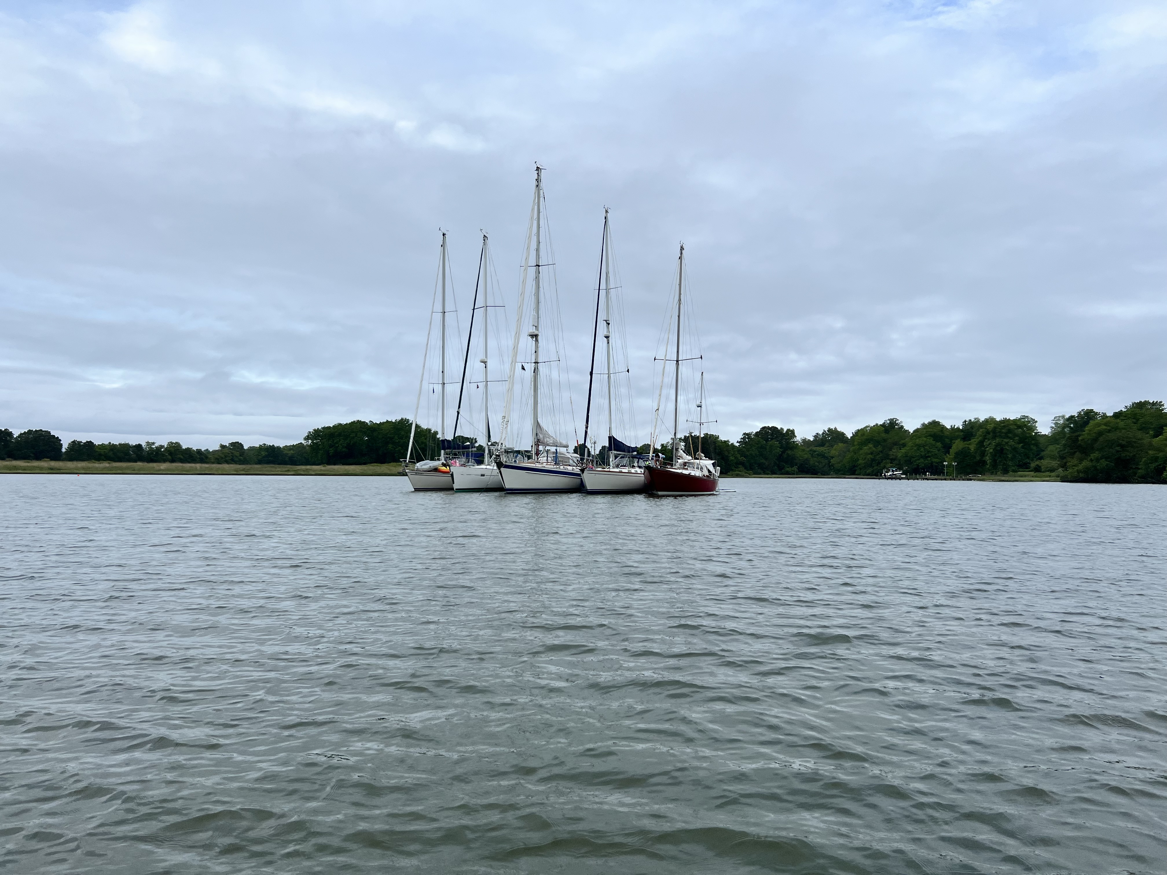 We all separated and went on our way by mid-morning. The anchor and chain was packed full of mud, which took a while to clean off. But a nice shiny Ultra cleans off easily. We motor sailed back out of Lloyd Creek, out of the Wye River and through the Eastern Bay. We caught up to Delfin and they got a great picture of us underway in a moist on/off drizzle of rain.
