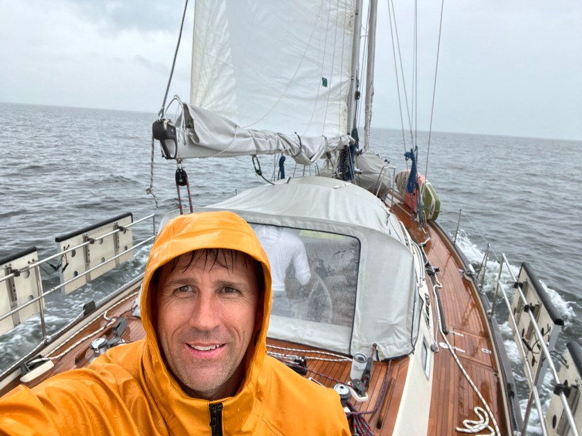 Soon, the rain was pelting us hard, and I donned my rain gear which is ridiculously yellow and meant for working the docks in Alaska. I texted Ray and he said they were getting hammered with rain at his house across the Bay from where we were. We were glad to had put up the sprayhood extension where the family could remain a bit more cozy than I was standing on the aft deck.
