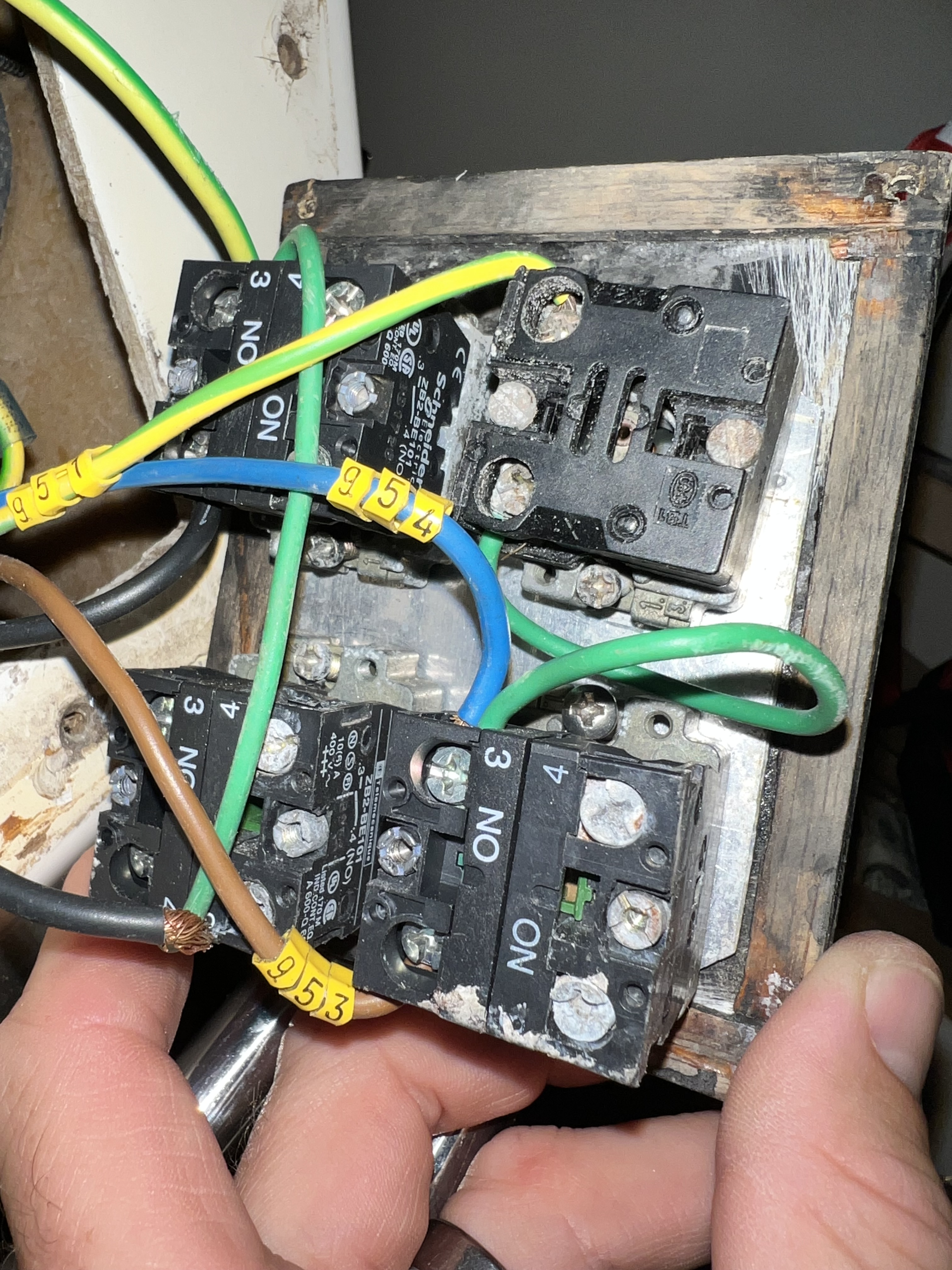 I started this project by researching which buttons to purchase. Looking at other HR helm panels on Yachtworld and on other blogs, I determined that the buttons were industrial buttons which are Eaton M22-style. In the picture below, the actual button (left) is a two-piece item with a male part that is inserted from the front of the panel and then a spinning nut on the the back. The electrical connections are also modular and click into the backside of the button. It is a simple system.