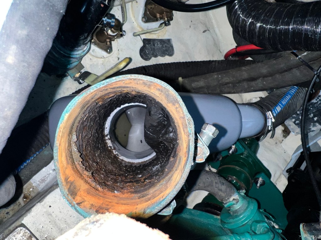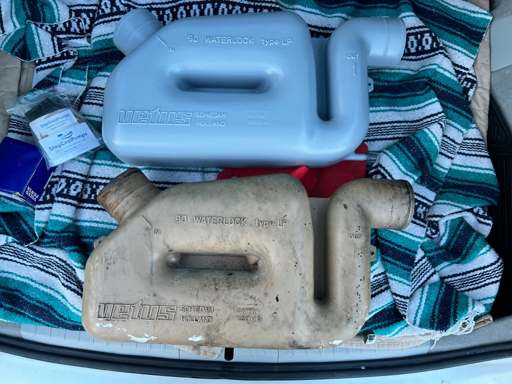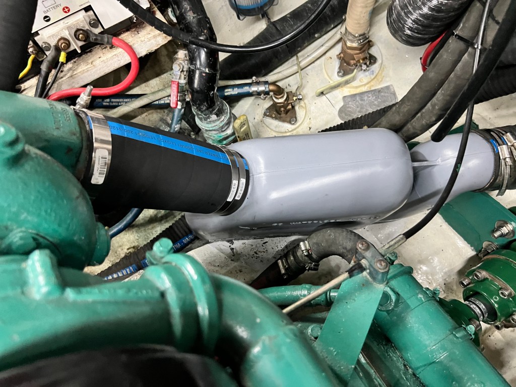 Later that weekend I browsed dozens of websites and even took a stroll into Fawcett to see what some other options might exist to replace the muffler. The cannister style mufflers just wouldn’t work without a lot of refitting. We waited for Wednesday, and the 90 mm Vetus waterlock LP replacement muffler was picked up from Bacon. Other than being gray in color it was a perfect match. They saved my bacon, for sure.