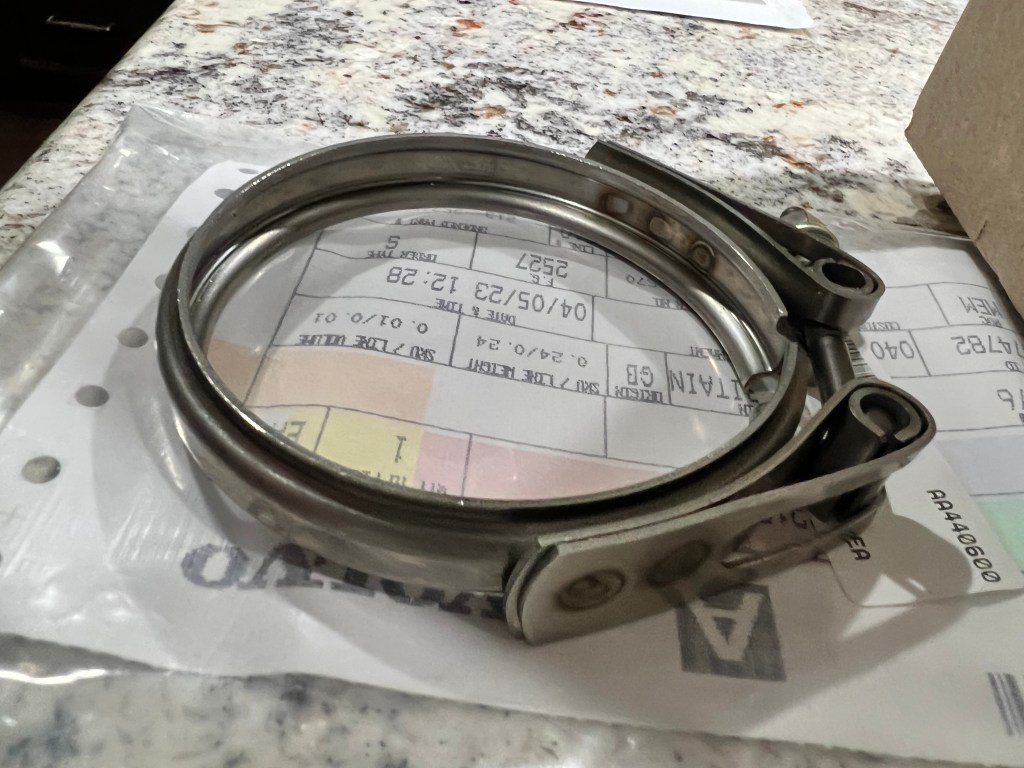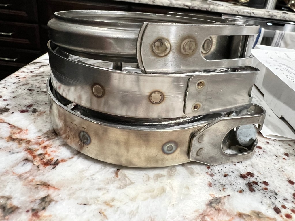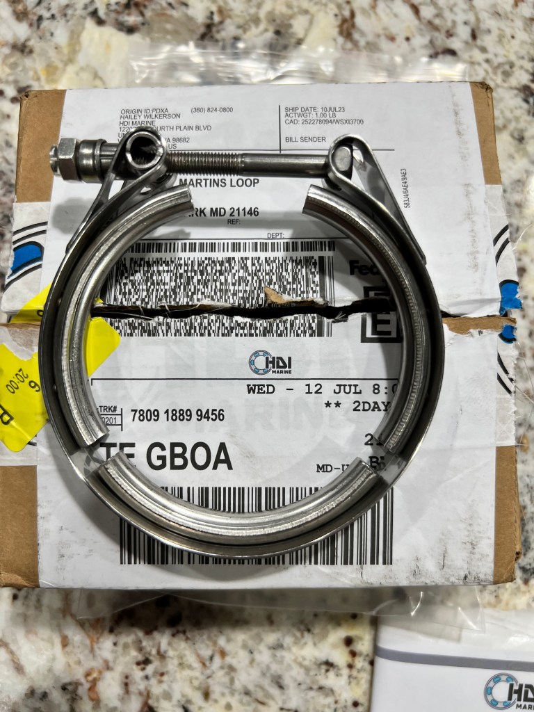 Look closely: You can see from these pictures that not all clamps are created equal. The profiles of these V-band clamps are all very different and their widths and general design are not the same. The quick and easy solution from AutoZone resulted in a mess in the engine bay which I had to clean up. It was so wide and had the wrong profile that it didn’t seal the exit of the turbo and sea water splashed all over during a quick test. I don’t know what I was thinking trying to use an auto part for our marine service.