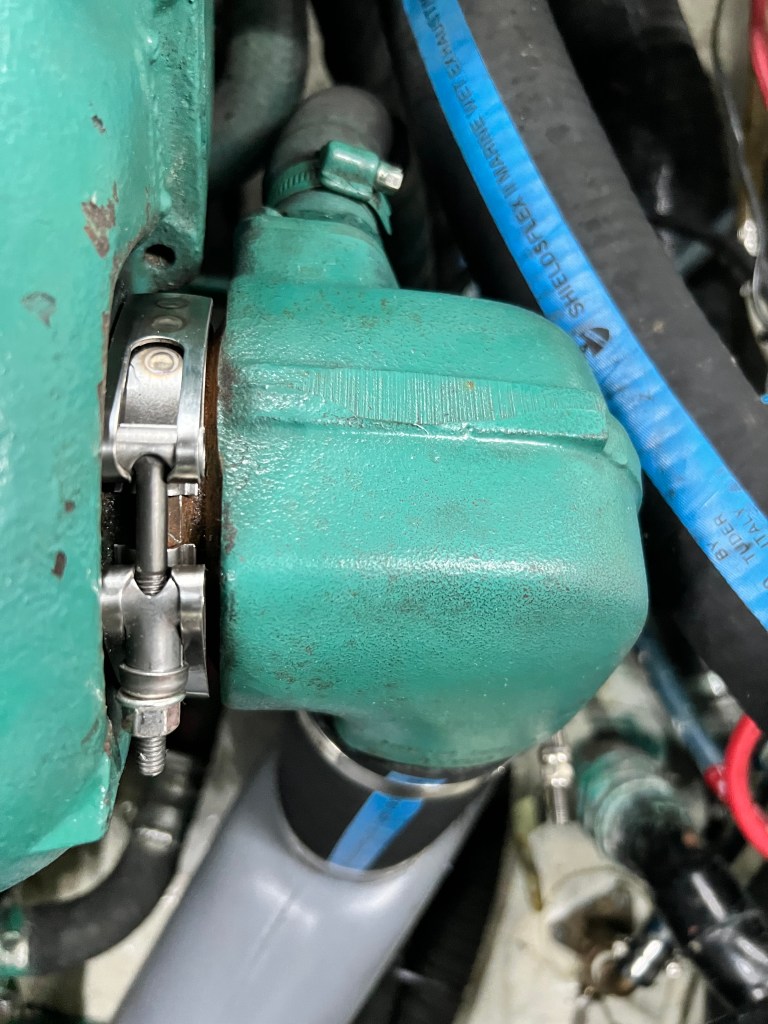 Waiting for the right one to arrive would wipe out another weekend. I impatiently wanted to get out on the water and test the engine which had obviously overheated. I had a new hose and muuffler installed, and the only thing stopping me was a clamp. I decided to improvise: I used a right-sized hex bolt to secure the elbow clamp just enough to make a run out into the Bay. It held just fine. But the question is…would you have done this?