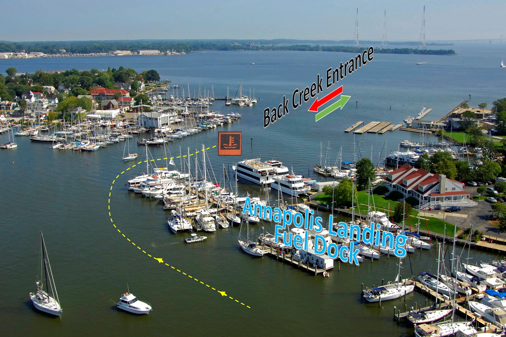 Due to the precariousness of the situation, we didn’t have the luxury to take alternative measures like raise sails to use wind to get moving or drop the dinghy in the water to push/pull the boat. So I decided to use the bow thrusters to turn the boat around without using engine RPM. We “limped” back up the Creek towards the fuel dock under low RPM and dropped the hook quickly (about the same location as the sailboat in the picture). Since I normally do the anchor work, I was also dealing with inexperienced crew (family) working that part of the boat.