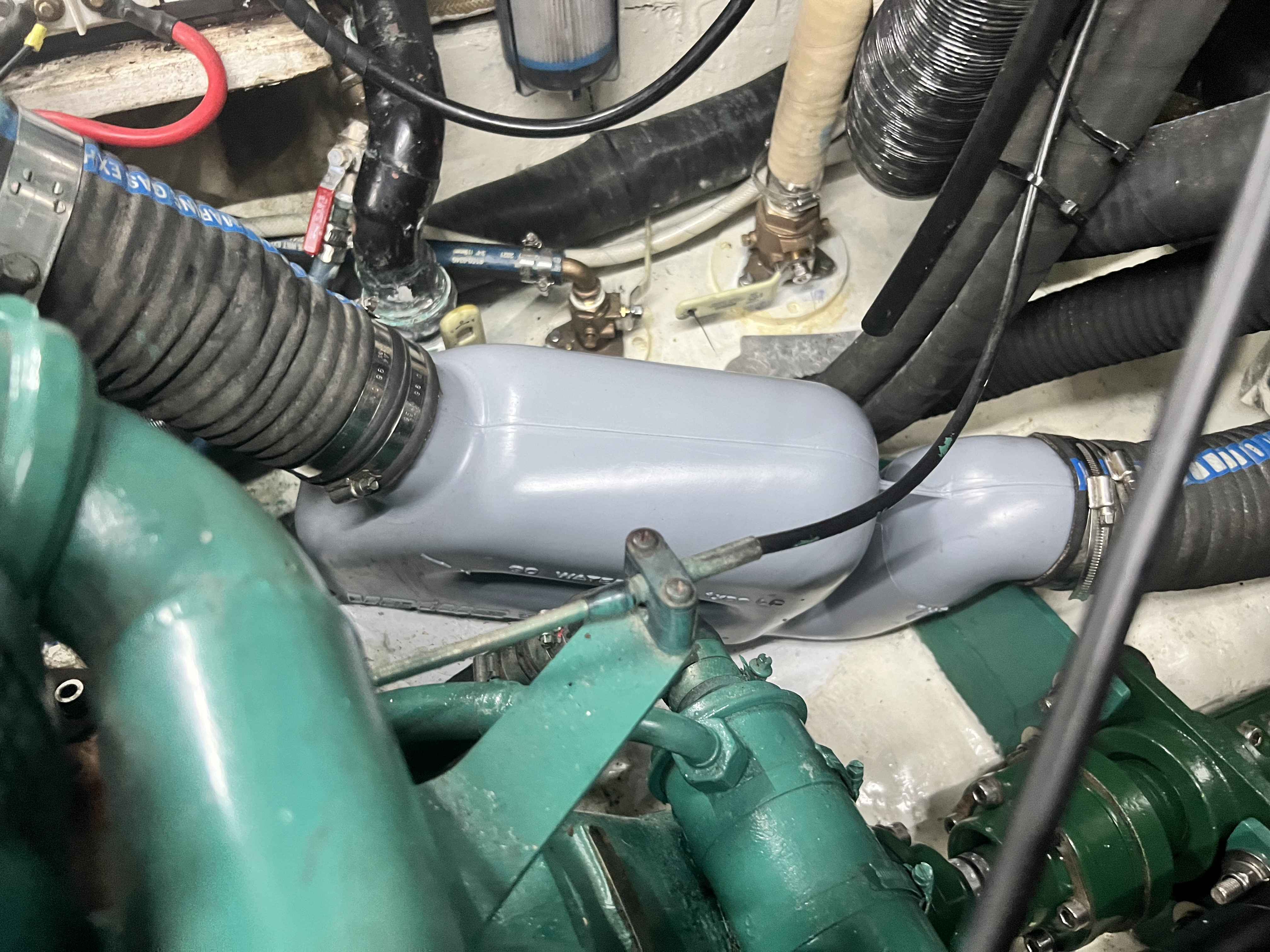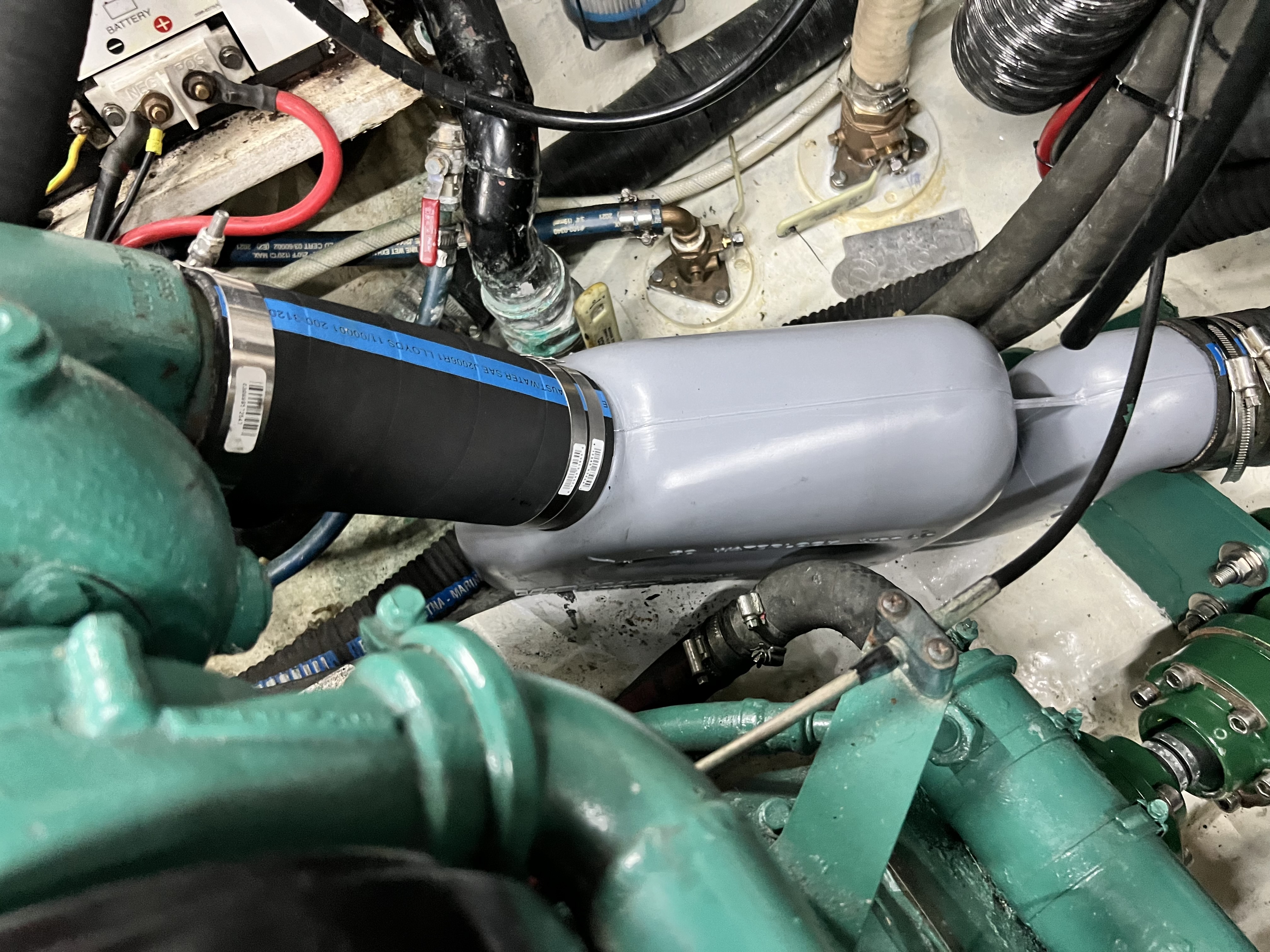 Later that weekend I browsed dozens of websites and even took a stroll into Fawcett to see what some other options might exist to replace the muffler. The cannister style mufflers just wouldn’t work without a lot of refitting. We waited for Wednesday, and the 90 mm Vetus waterlock LP replacement muffler was picked up from Bacon. Other than being gray in color it was a perfect match. They saved my bacon, for sure.