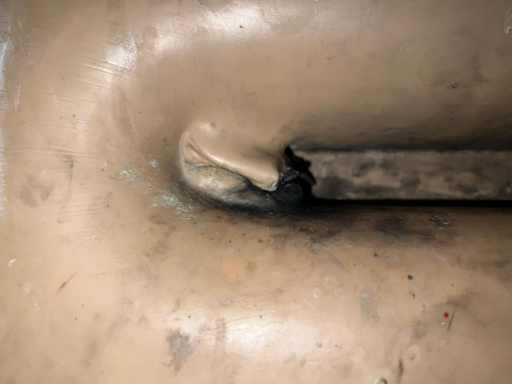 After a few minutes, I cooled down (slightly). After restarting the engine again, the kids were yelling “there is smoke in the engine room”. Turn the key, go down below. I peeked into the engine bay, and immediately saw that water was coming out of the Vetus muffler. It melted under extreme heat and created a hole which I could not see but I could feel water flowing out of the unit on the backside.