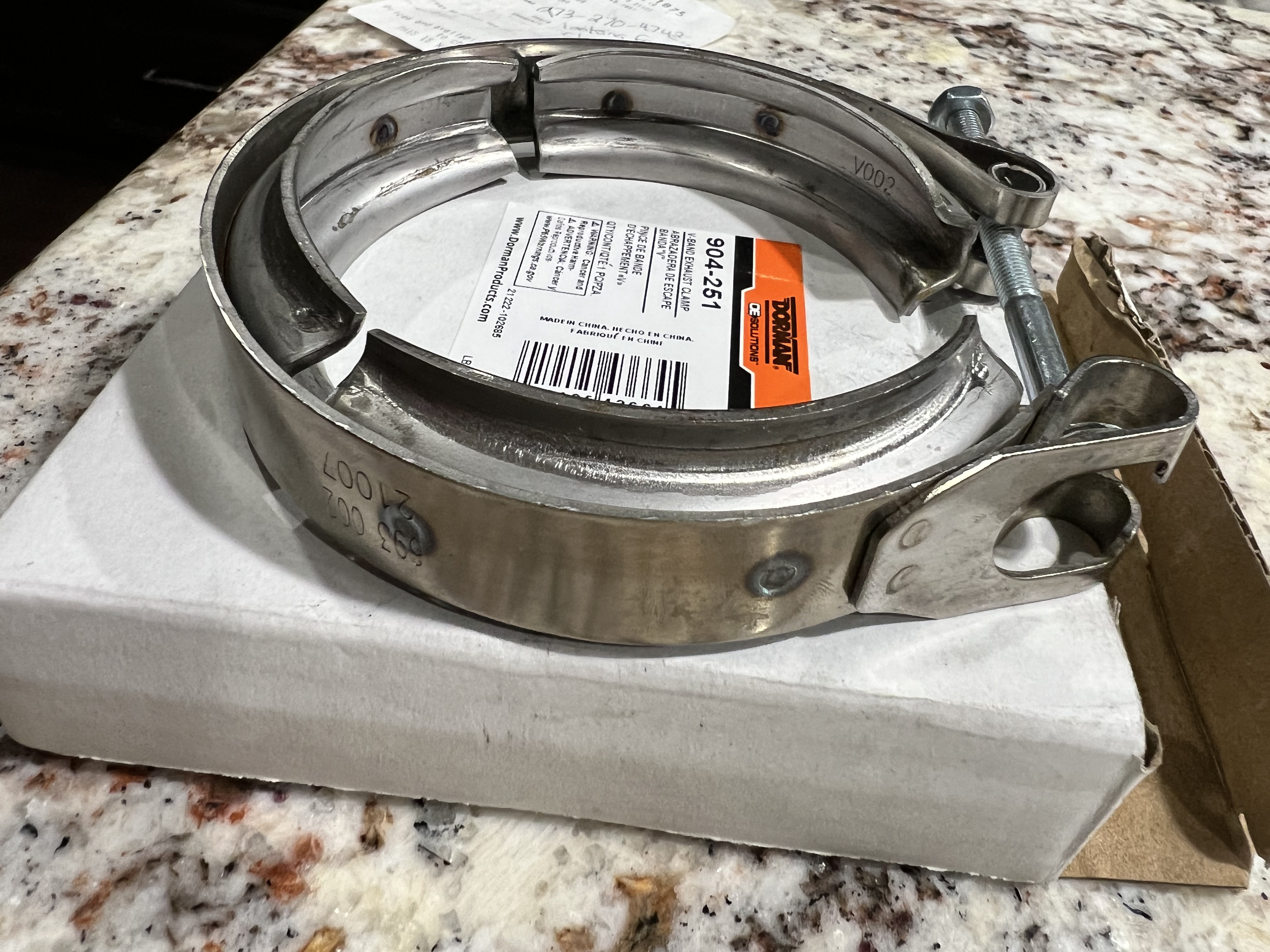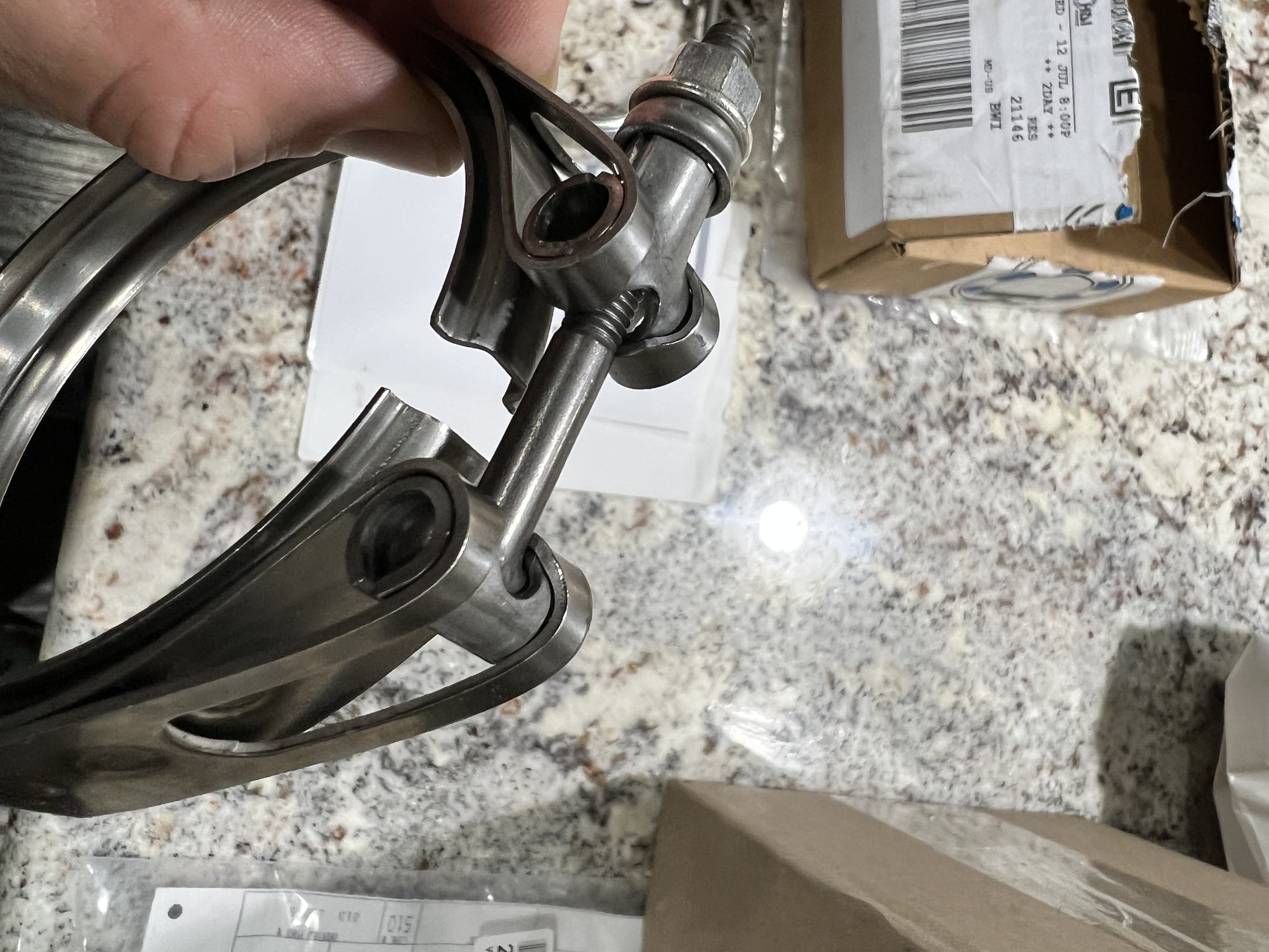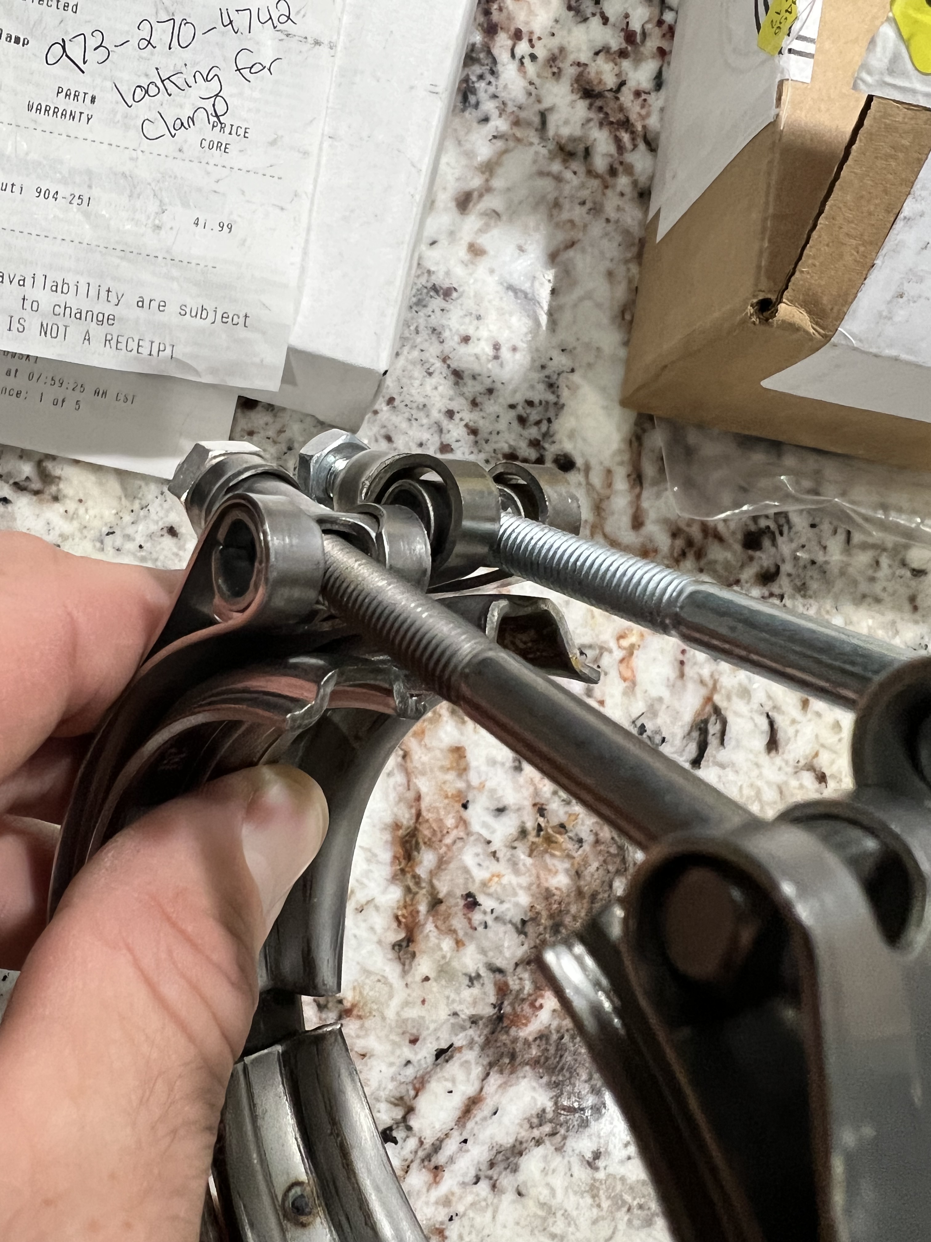 The elbow wasn’t sealing like I wanted it to. I struggled to manipulate the heavy assembly and get the elbow face to seal perfectly. After several frustrating attempts where the two faces remained on an odd but small angle difference apart, I considered the concept to tighten the clamp and that this would cause the elbow face that the turbo face to seal. SNAP! The t-bolt on the clamp failed. That was a big whoops.