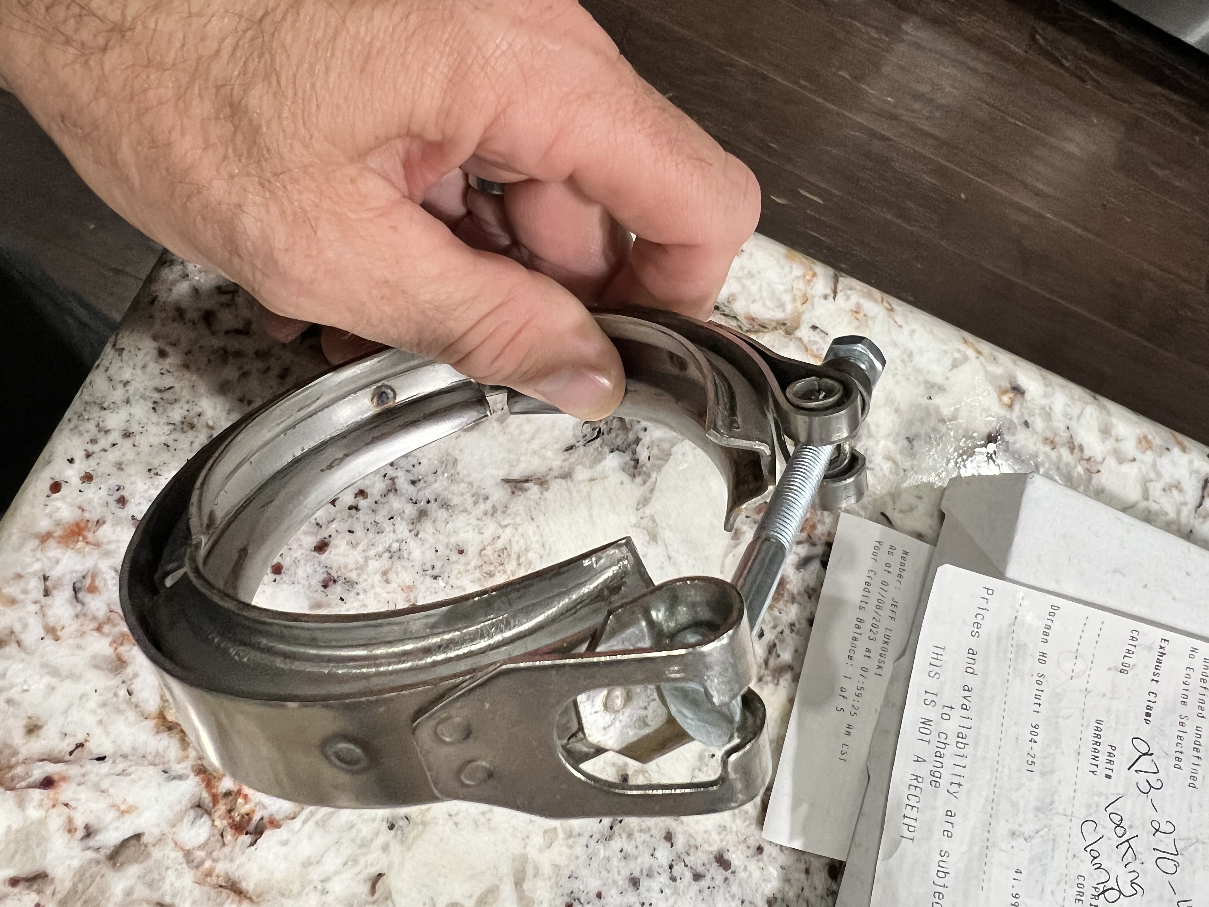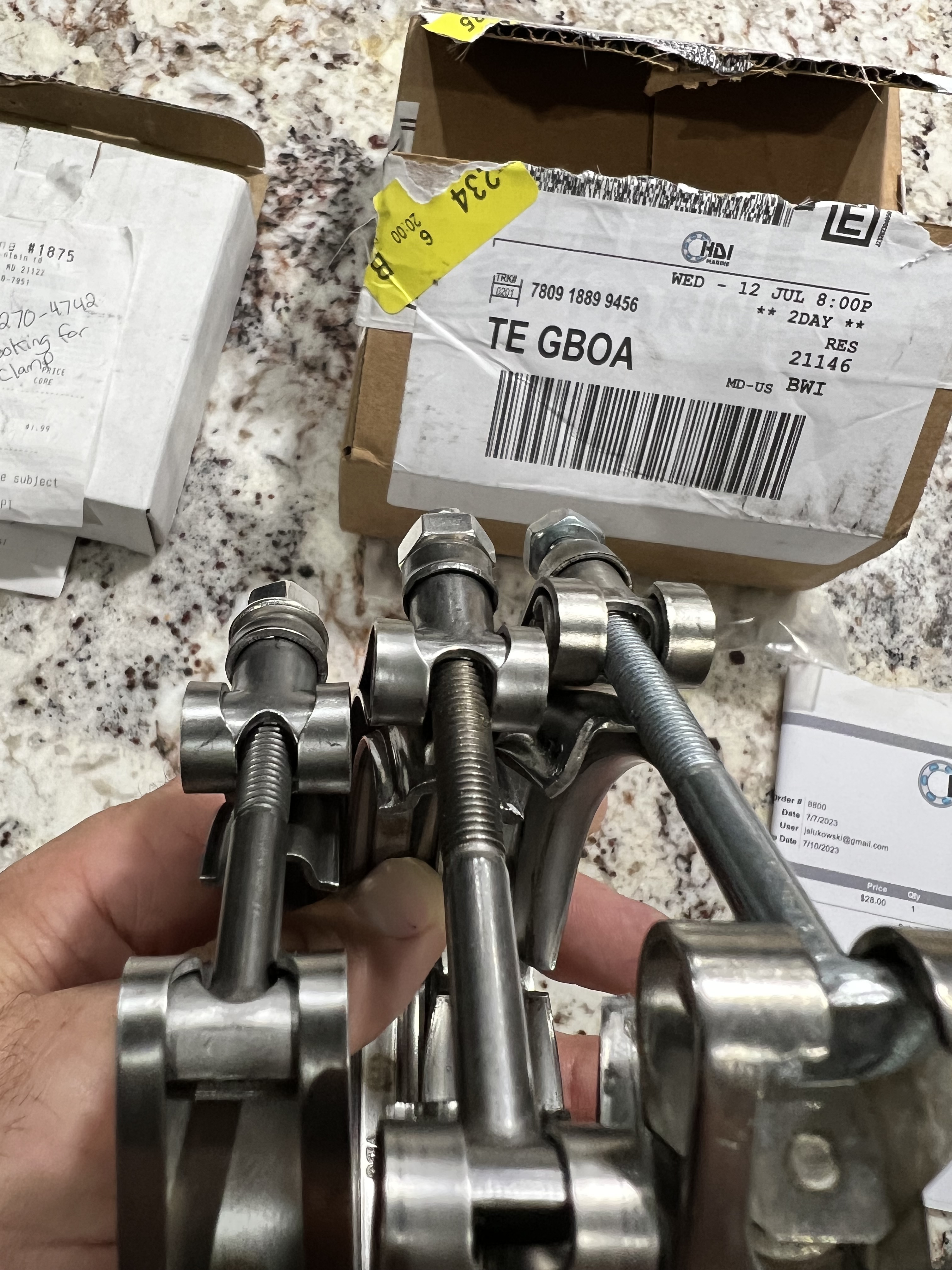 After I cleaned the exhaust elbow and inspected it, I immediately started searching on the internet for the right clamp. (I could not believe this nightmare was still continuing.) Out of desperation, I ordered clamps from auto parts stores and from two different marine shops online. These clamps have very different profiles, but it is very hard to tell this from online pictures and part number matches.