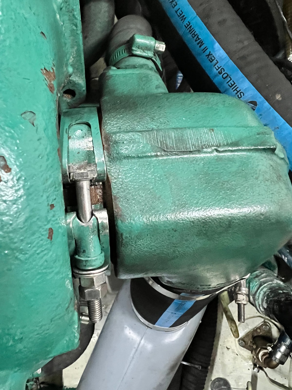 Look closely: You can see from these pictures that not all clamps are created equal. The profiles of these V-band clamps are all very different and their widths and general design are not the same. The quick and easy solution from AutoZone resulted in a mess in the engine bay which I had to clean up. It was so wide and had the wrong profile that it didn’t seal the exit of the turbo and sea water splashed all over during a quick test. I don’t know what I was thinking trying to use an auto part for our marine service.