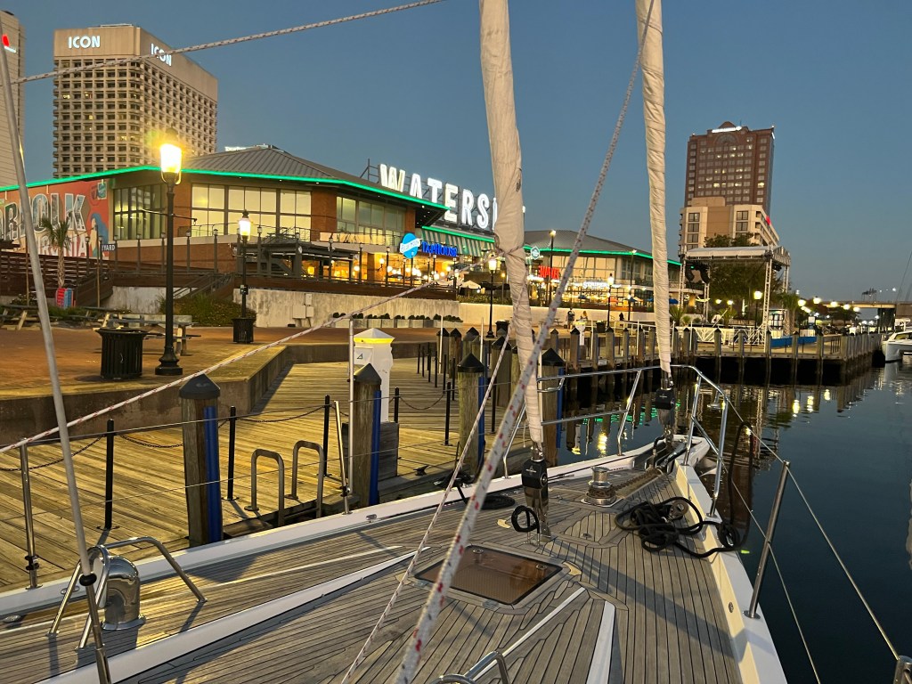 While others put away the provisions, Captain and I worked on replacing a propane solenoid then I installed the jack lines. After a while we were all very hungry so we got off the boat and walked over to the Marriott restaurant for a great meal.