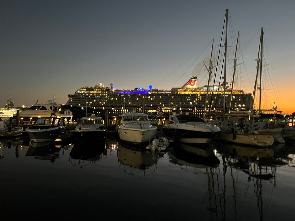 We had a very peaceful end to the evening watching a cruise ship depart and looking our past the marina. We set sail tomorrow and can be tracked at https://sdsatracking.com/fall2023. Search for Nikitoo.