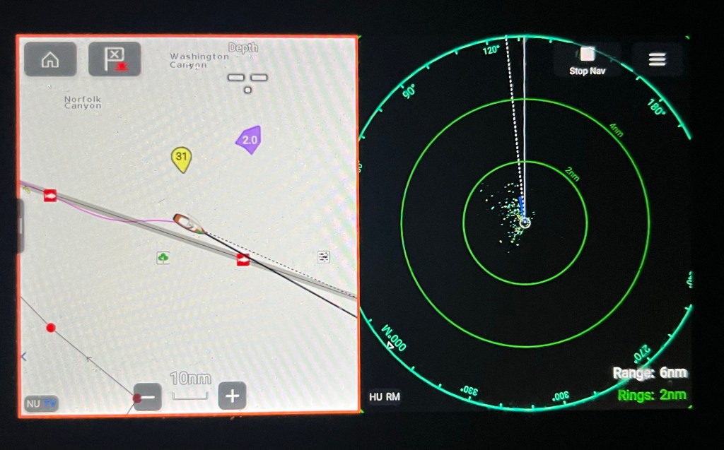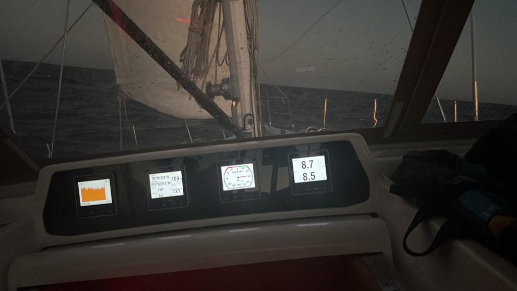 Overall for the first 24 hours we went over 210 nm, and we had winds 25-35 knots sustained and 2-3m seas hitting us from the beam. There was not much marine traffic last evening. That kept things simple. Weighing in at over 90,000 lbs, Nikitoo was rocking back and forth all evening. That reminded us who was in control of our destiny.