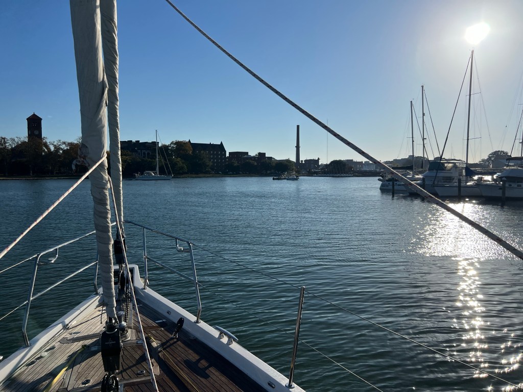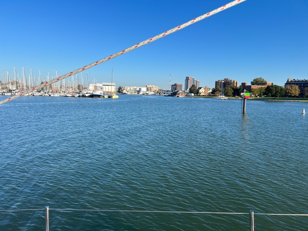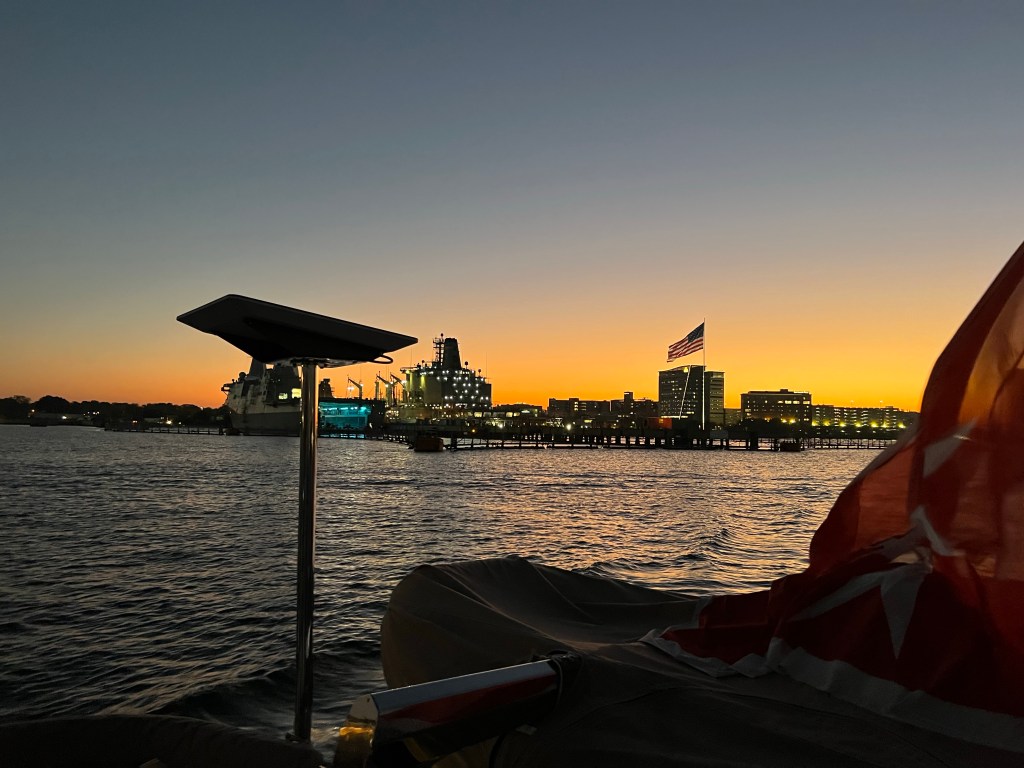 We anticipate the total trip will be around 1,400 nm and take between 8-10 days. The crew of 4 Brits, 1 Bulgarian and myself left the Waterside Marina on Norfolk just before dawn. We saw the sun rise, heard the Star Spangled Banner playing at the Naval Station.