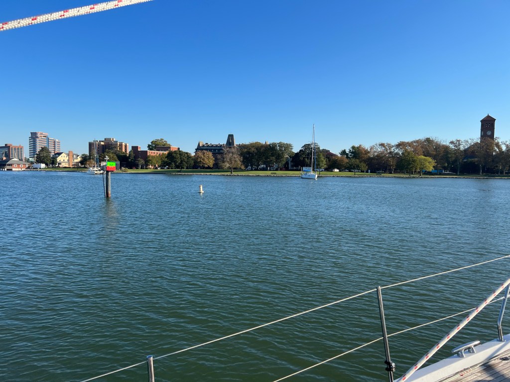 After a quick sunrise picture, we motored into Hampton to fuel up. Apparently l, the Old Point Comfort Marina fuel dock was not large enough to accommodate the Oyster 625. There were some very well manicured homes and yards overlooking this area.
