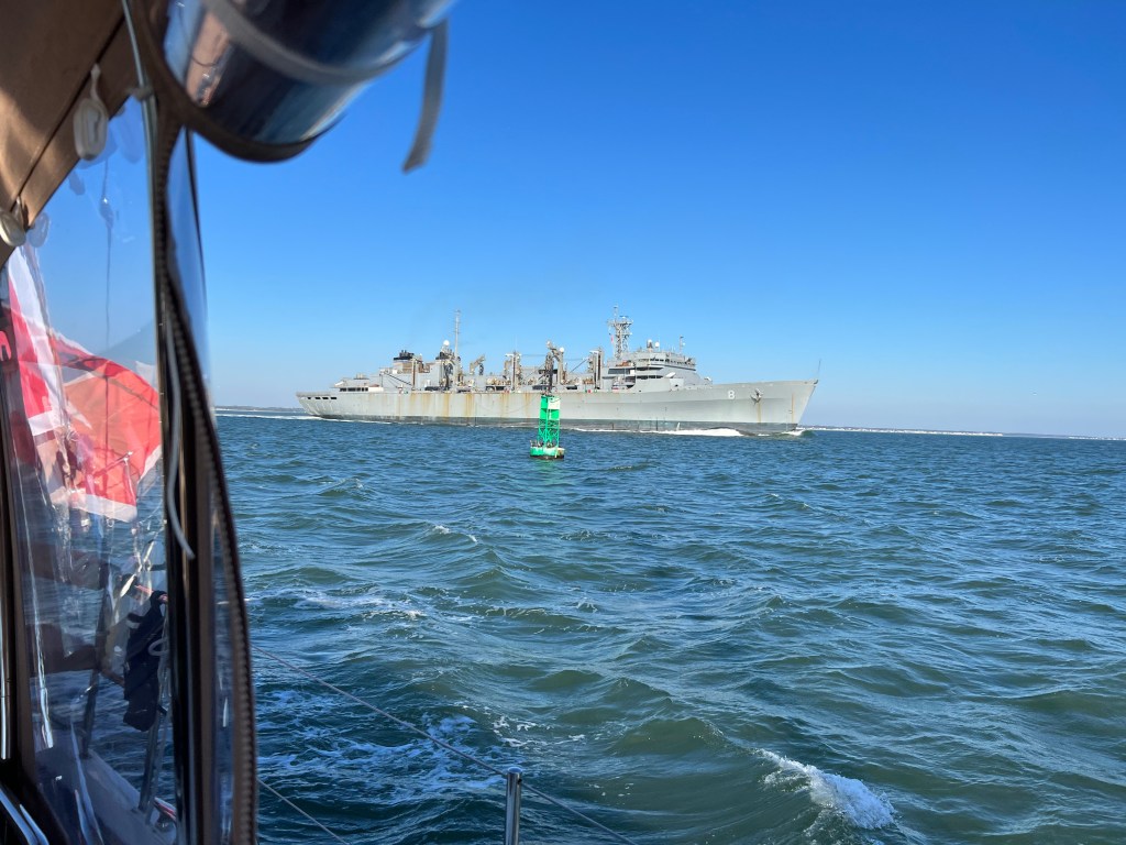 On the way out of the Chesapeake Bay we saw the usual military vessels preparing for firing drills. They were all pleasant on the phone. I was hoping one of the Brit crew members to make some funny remark on the VHF, but the cI realized that this is not time to make fun with US ship outgunning us.