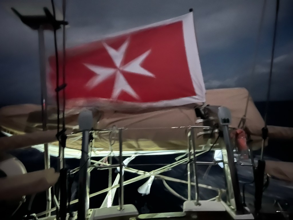 Nikitoo is a Maltese flagged vessel, and the flag at the transom which is effectively welded to the dinghy davits is showing strong winds. I was feeling a bit seasick but 1 pill of Dramamine, some salty Pringle chips and a Pepsi did the trick.