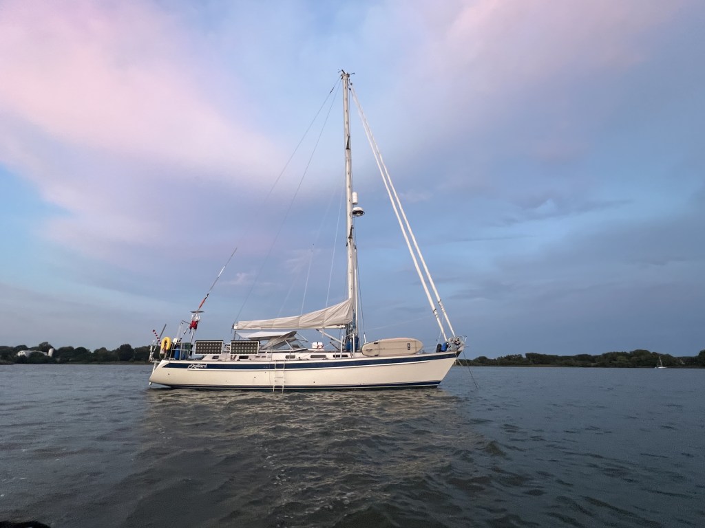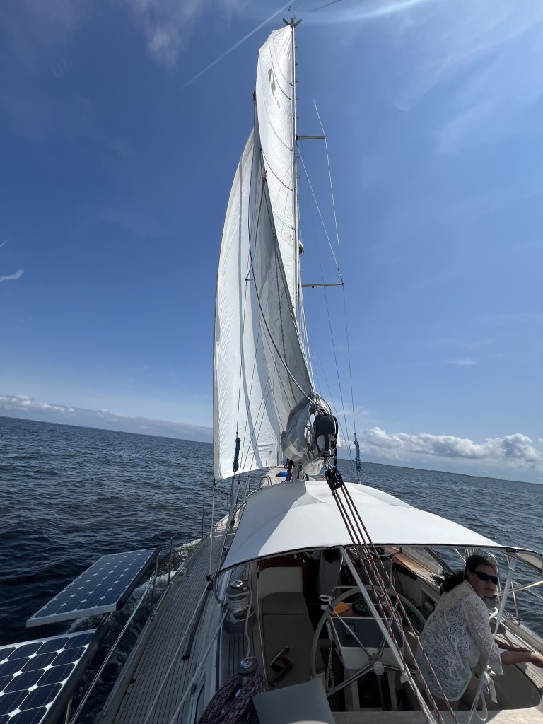 We picked up anchor the next morning and pounded into some stiff winds and steep waves departing the Chester River. That was not completely expected. On the way out, a pair of beautiful motor yachts passed us. This capped off another restful and happy weekend aboard our reliable and well-built Hallberg-Rassy.