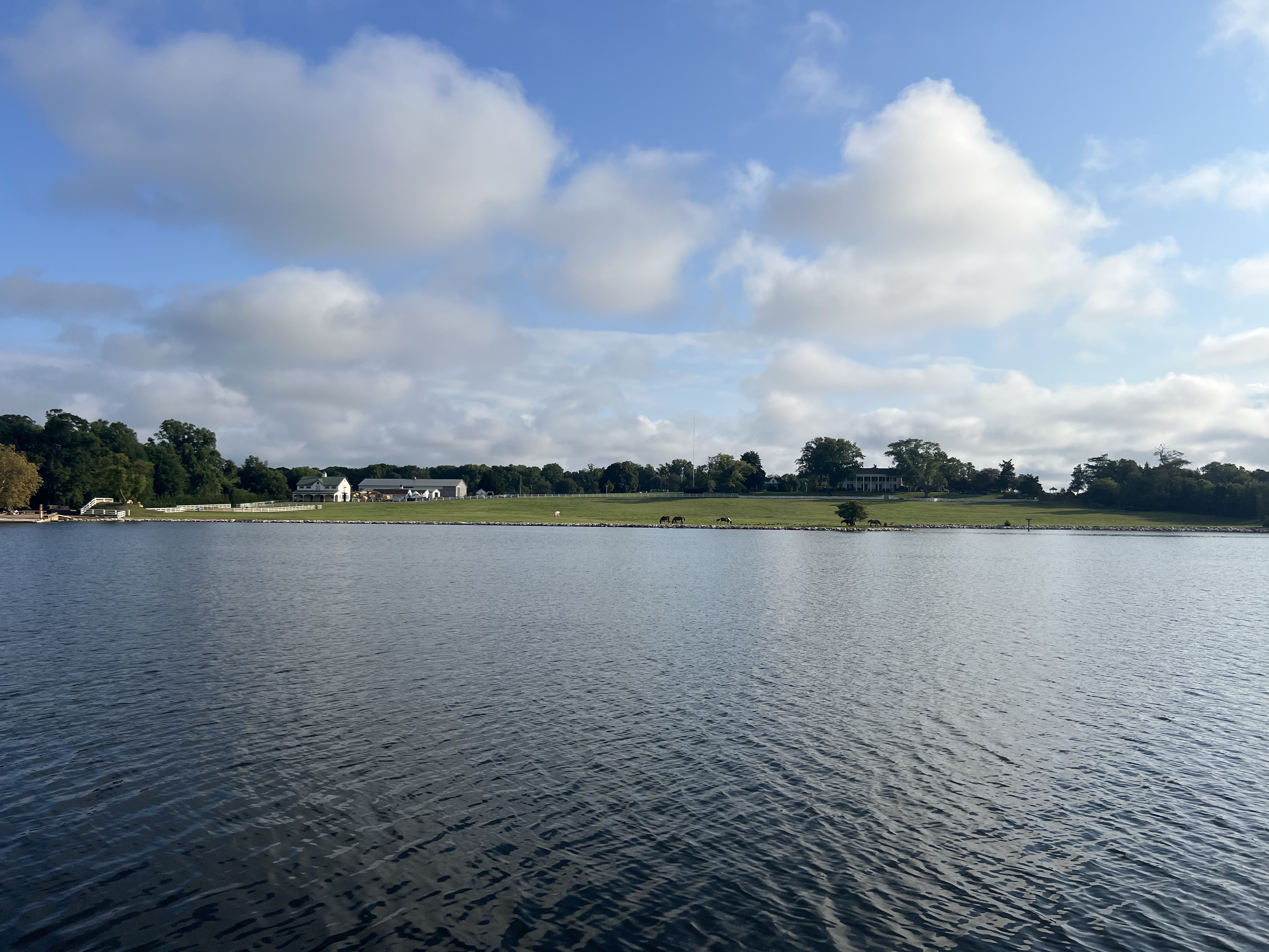We made it before dark! We had plenty of space to anchor, but I must admit that it took us a couple of attempts. The first time, we felt a little too close to the boat in front of us. So we pulled up and went around in front of them. The views from this side of Gibson Island did not disappoint as we were very close to the horse farm.