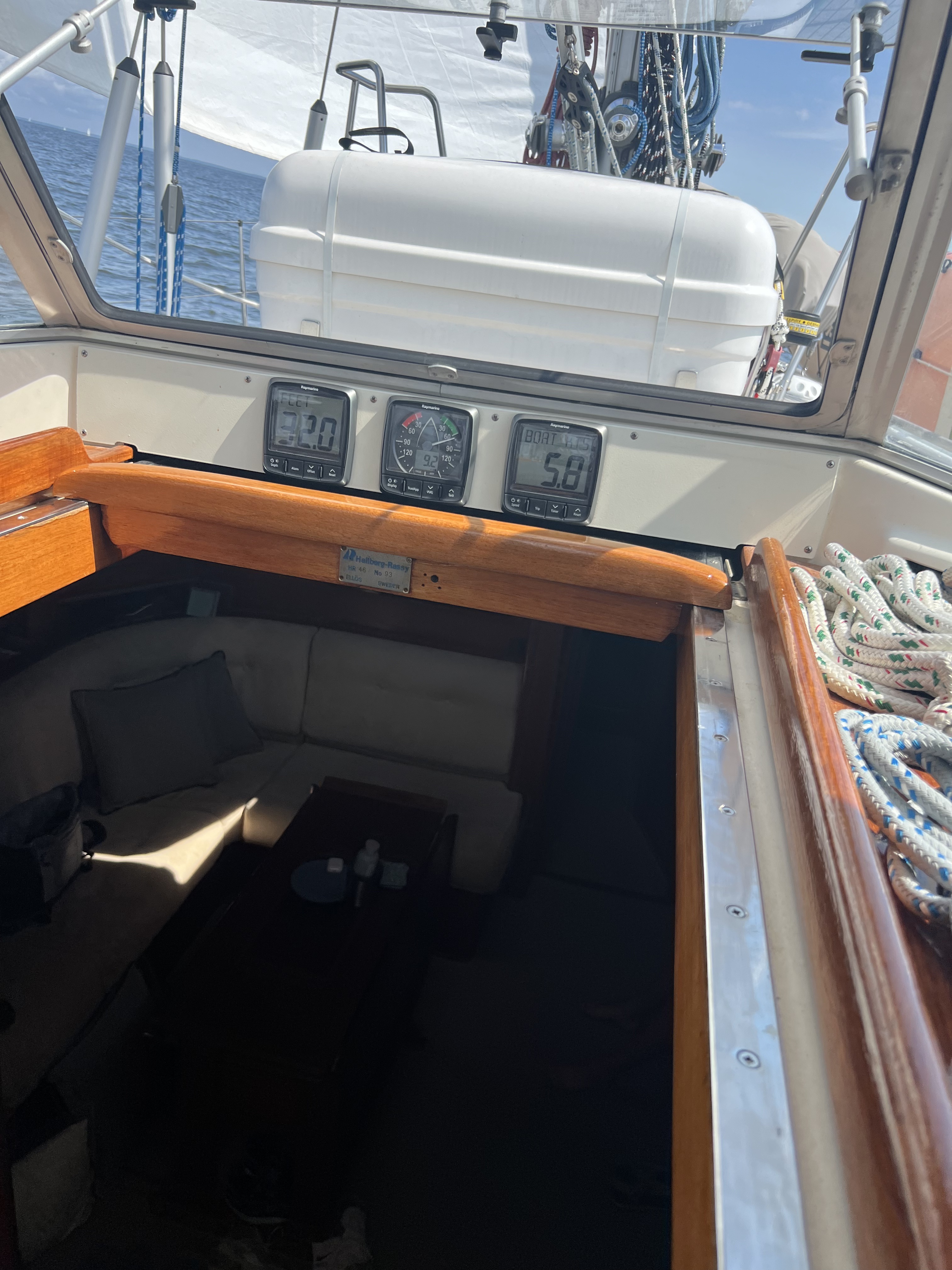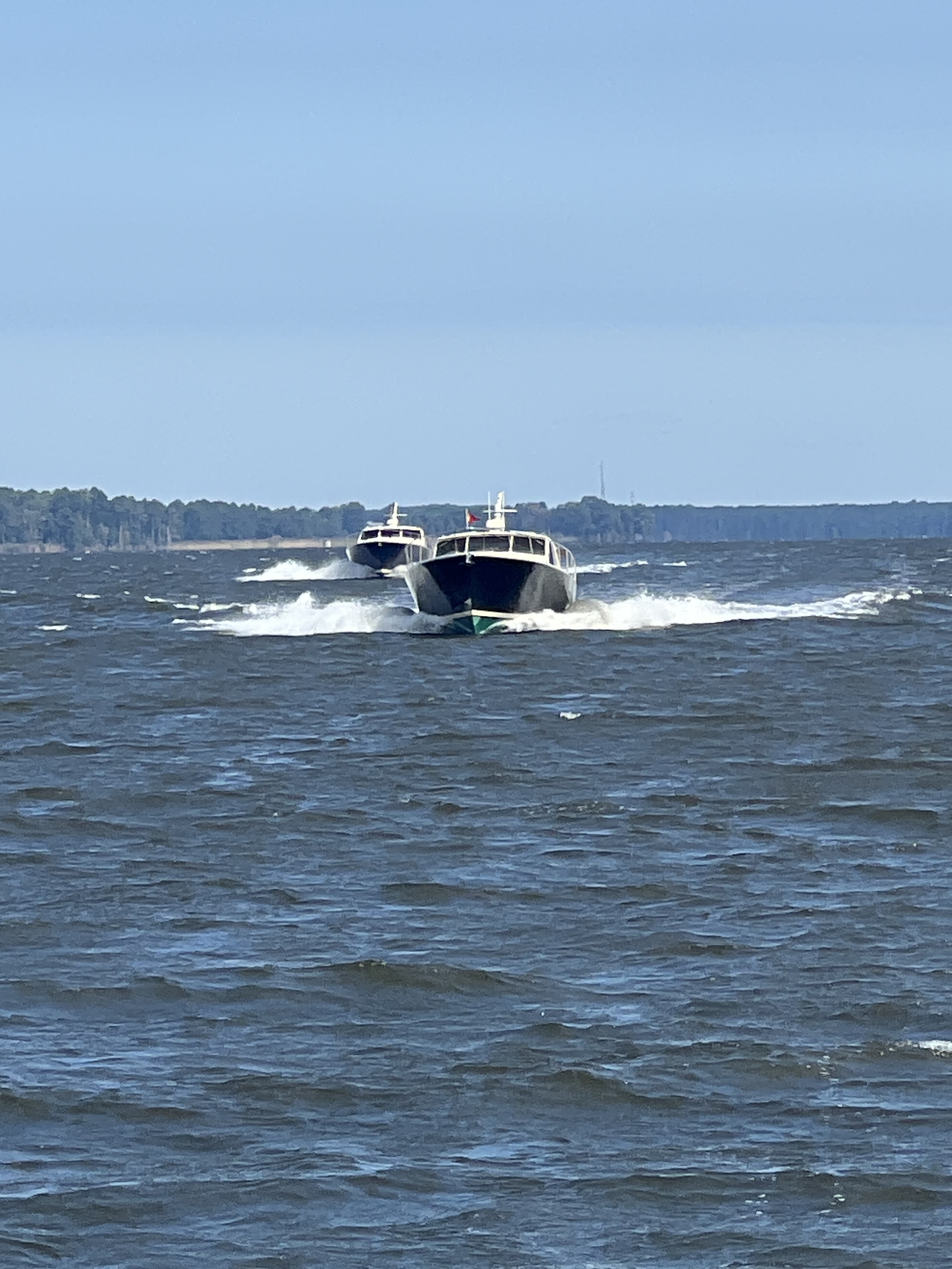 We picked up anchor the next morning and pounded into some stiff winds and steep waves departing the Chester River. That was not completely expected. On the way out, a pair of beautiful motor yachts passed us. This capped off another restful and happy weekend aboard our reliable and well-built Hallberg-Rassy.