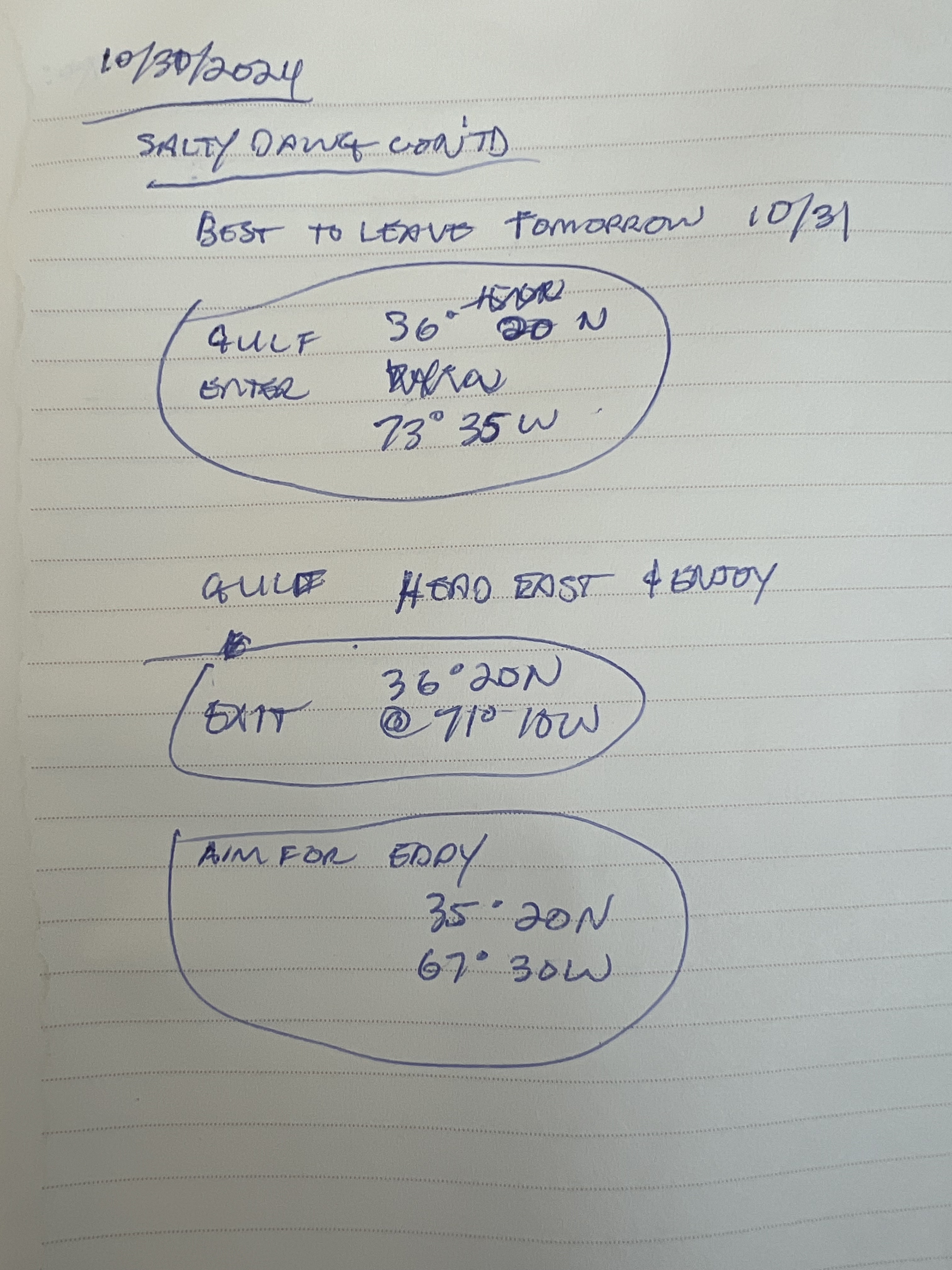 Chris Parker gave some clear guidance about getting across the Gulf Stream, which I dutifully wrote down, because I knew I would forget the instructions. Most importantly, it was quite clear that our best window to depart was the morning of Halloween and not to wait until November 1st. The only regret was that I didn’t pick up one of the Salty Dawg crew welcome bags that had our t-shirts in them! Oh well, an Uber ride to the marina was next followed by short dinner with the crew.