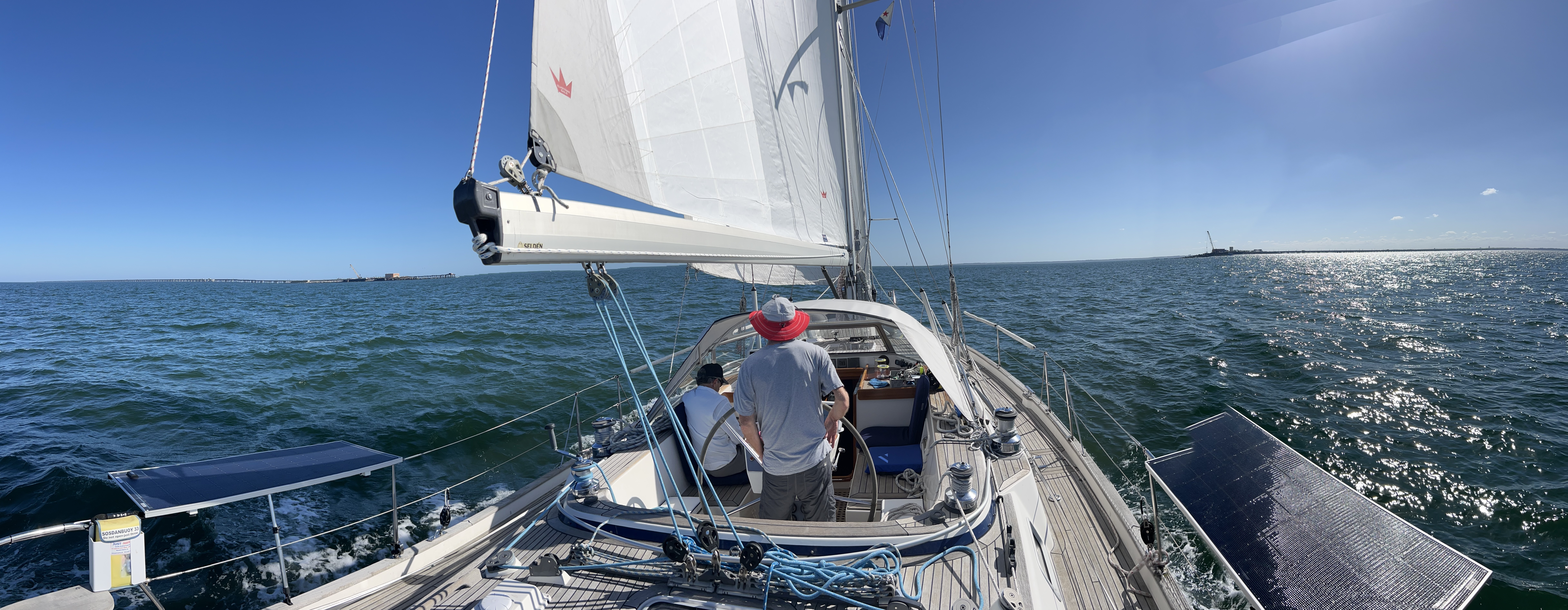 It was going swimmingly well. Greg was in a good mood and broke out his gift to us all — MUSTO vests with embroidery to commemorate the trip. Then we hit some wind outside the protection of land, and it was game on. Heeling at 25 degrees, it was time for life jackets and tethers.