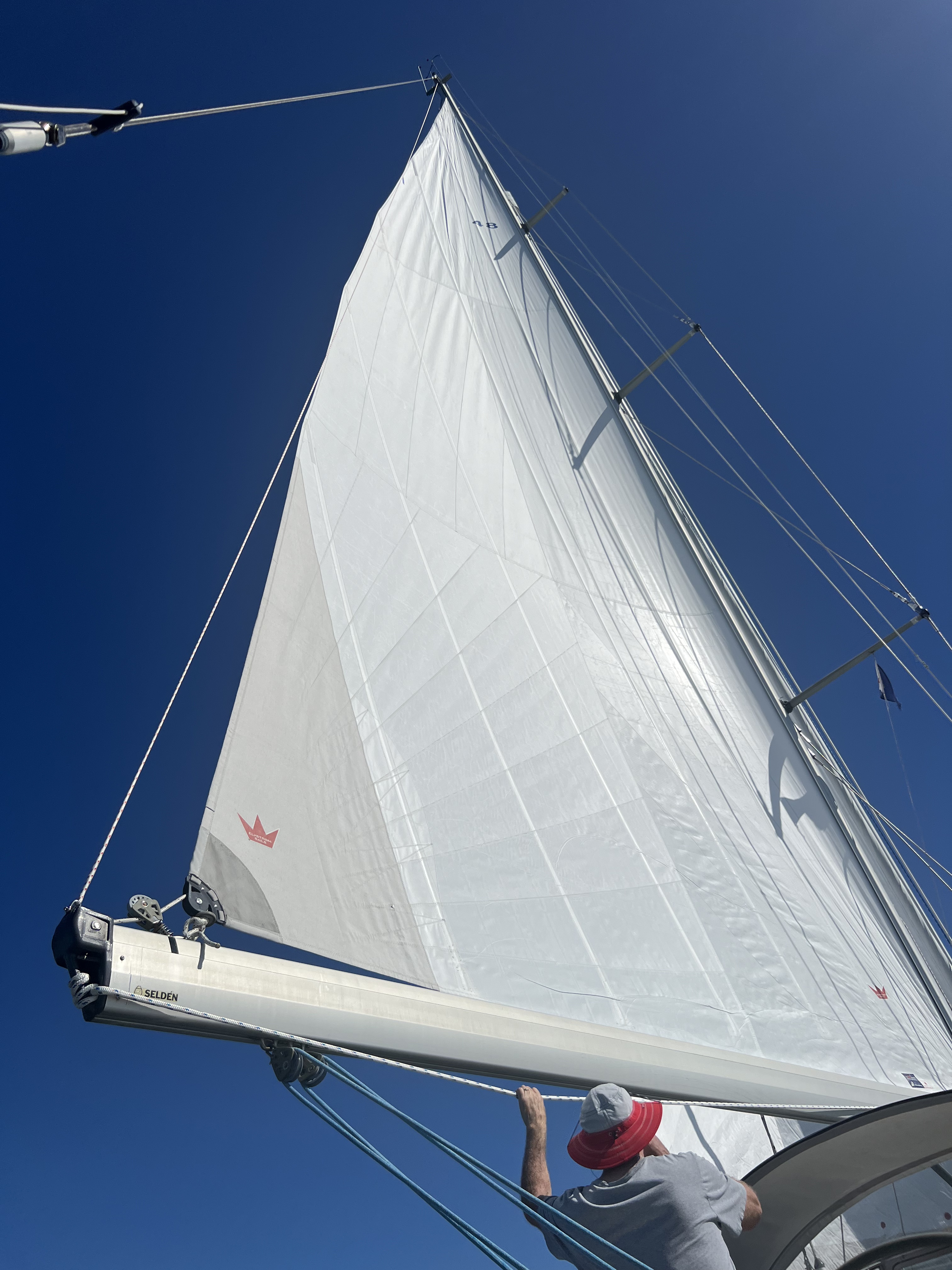 Right in the middle of the leg, I was again at the helm, and this time I heard and felt a “pop” just under me. I had a very strong instinct that something just wrapped around the propeller. The engine temperature started climging up to 90 degrees Celcius. That was far too warm for our liking, so we dialed back on the engine RPM to try to give the engine a break. That seemed to work, and the next morning, we pulled out the Code 0. That sail propelled us to 7.5-8.5 knots of boat speed for a good part of the day.