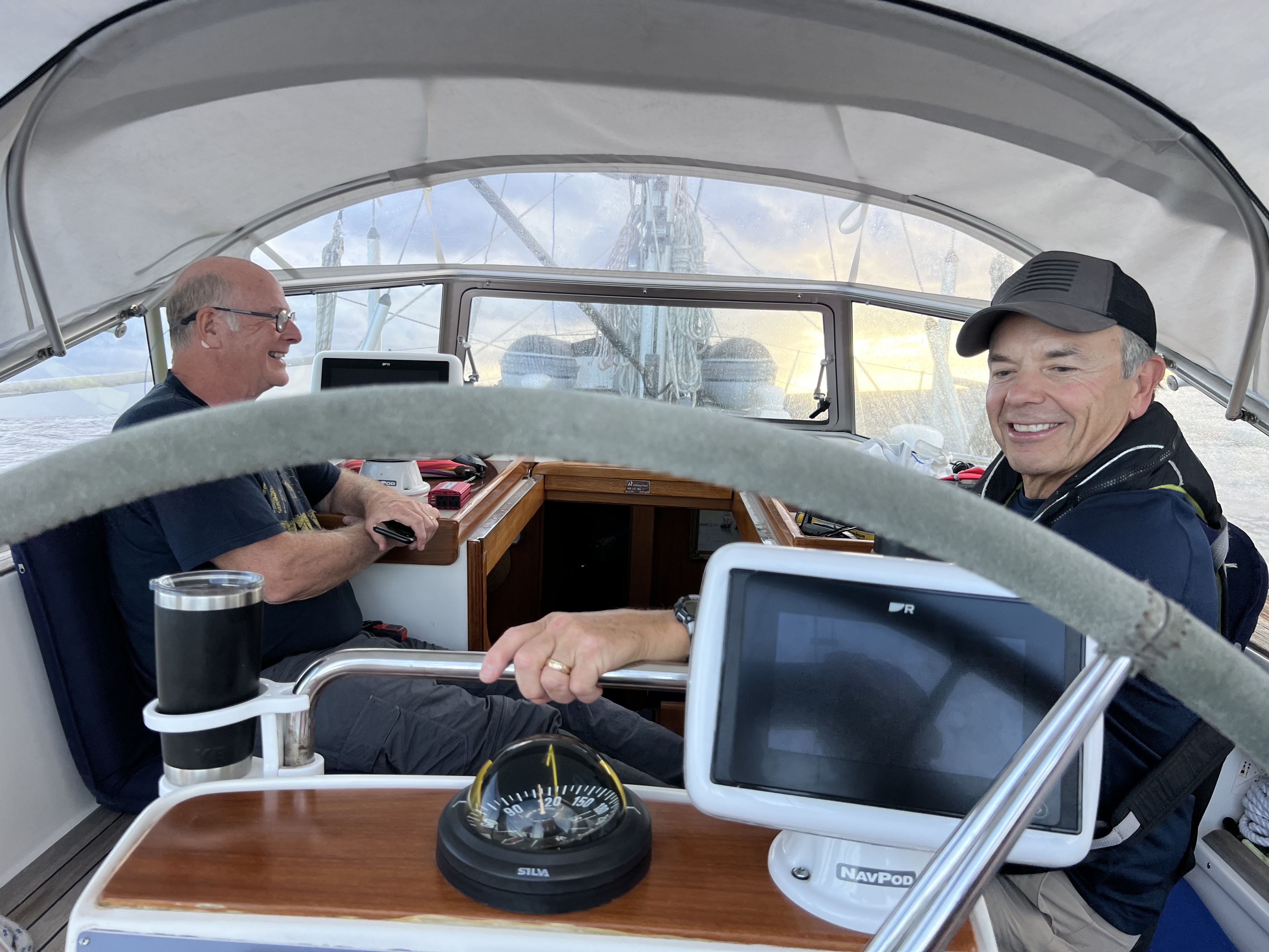 Crewmates David and Bud were a hoot. We all shared some fun and relatable stories on the trip. David was uber confident behind the wheel, and Bud was like a crypto dealer having anything to do with technology. Bud cracked out his sextant (how did he pack that?) and don’t let him fool you…we were rocking so much that it made celestial work a challenge. He did look good doing it though!
