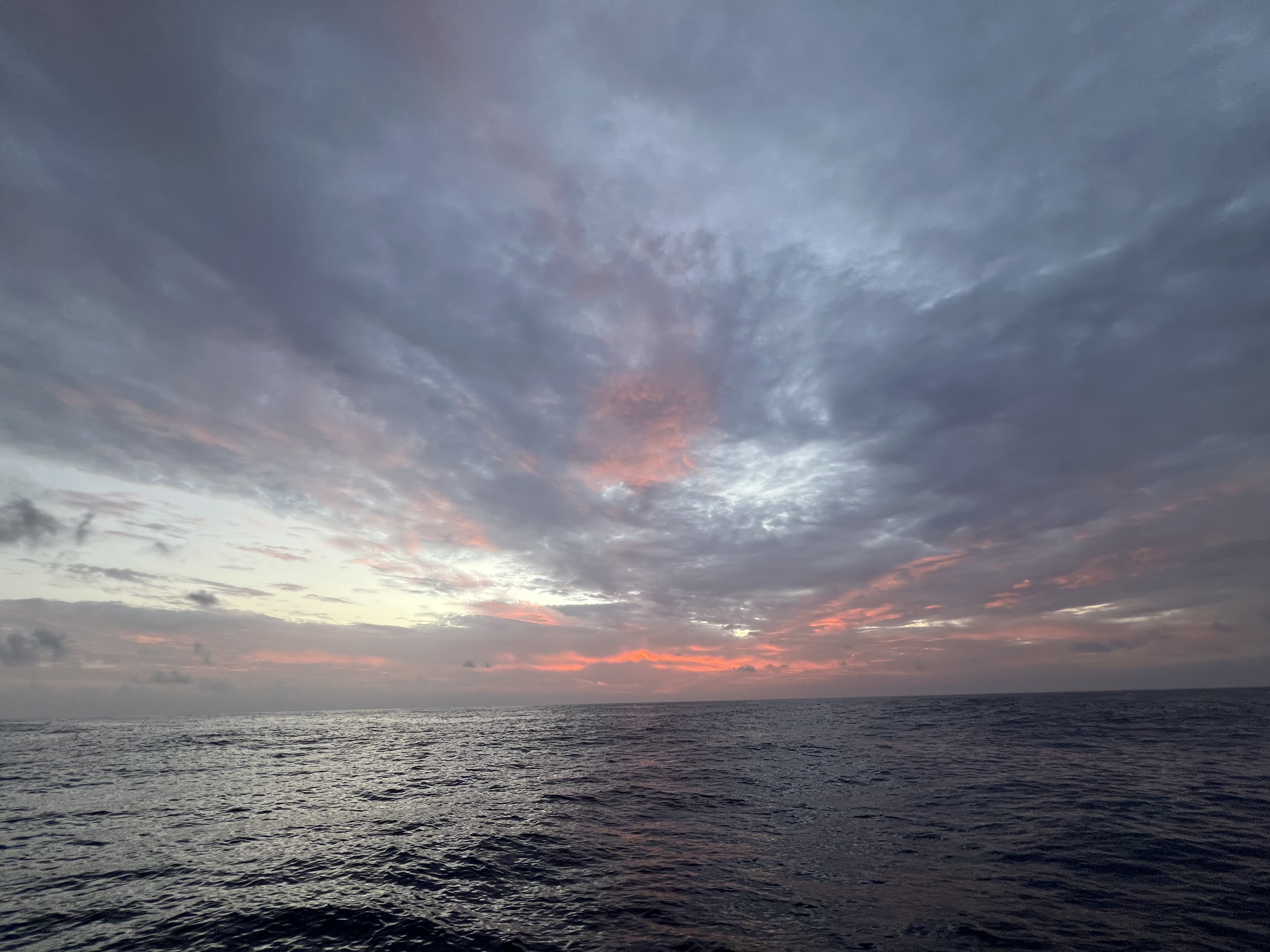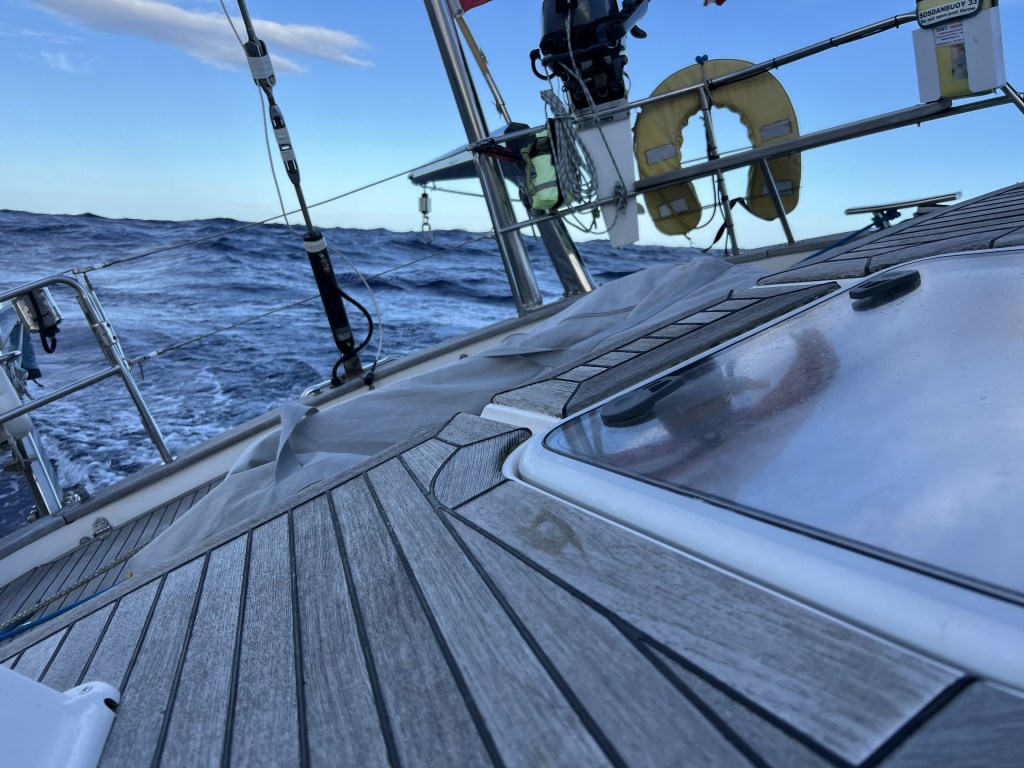 The captain went down below and tightened the bolts. I assumed the bolts got stretched during the accidental gybe. We were all very happy to have caught this in daylight and that we didn’t have to experience the traveler track getting ripped off the deck at night. We pushed forward sailing as much as possible. I noticed that green water would stack up on the deck and wouldn’t drain quickly. So I started dreaming about scuppers as the sun set a few times.