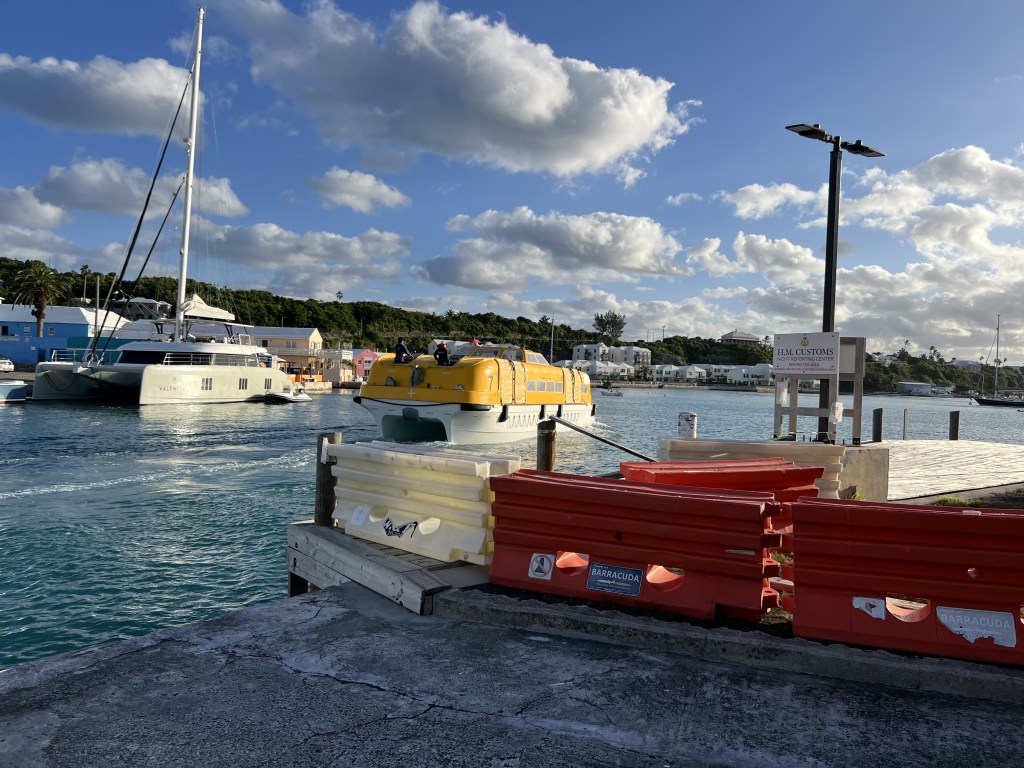 The entrance to St. George’s is fairly narrow, but once we were in the protected harbor, we jumped on a mooring at St. George’s Dinghy & Sports Club. Embarrassingly, it took us about 7 tries to get onto the mooring, but we were all a bit tired and weary from the relatively choppy and rough approach into Bermuda. When we got to Customs, a life boat from a cruise ship sped into the tiny alley area and dropped off a sick passenger. We walked all over town and caught a nice view of Astra on the mooring as well as gazed at the sailors-in-training with their pink sails.