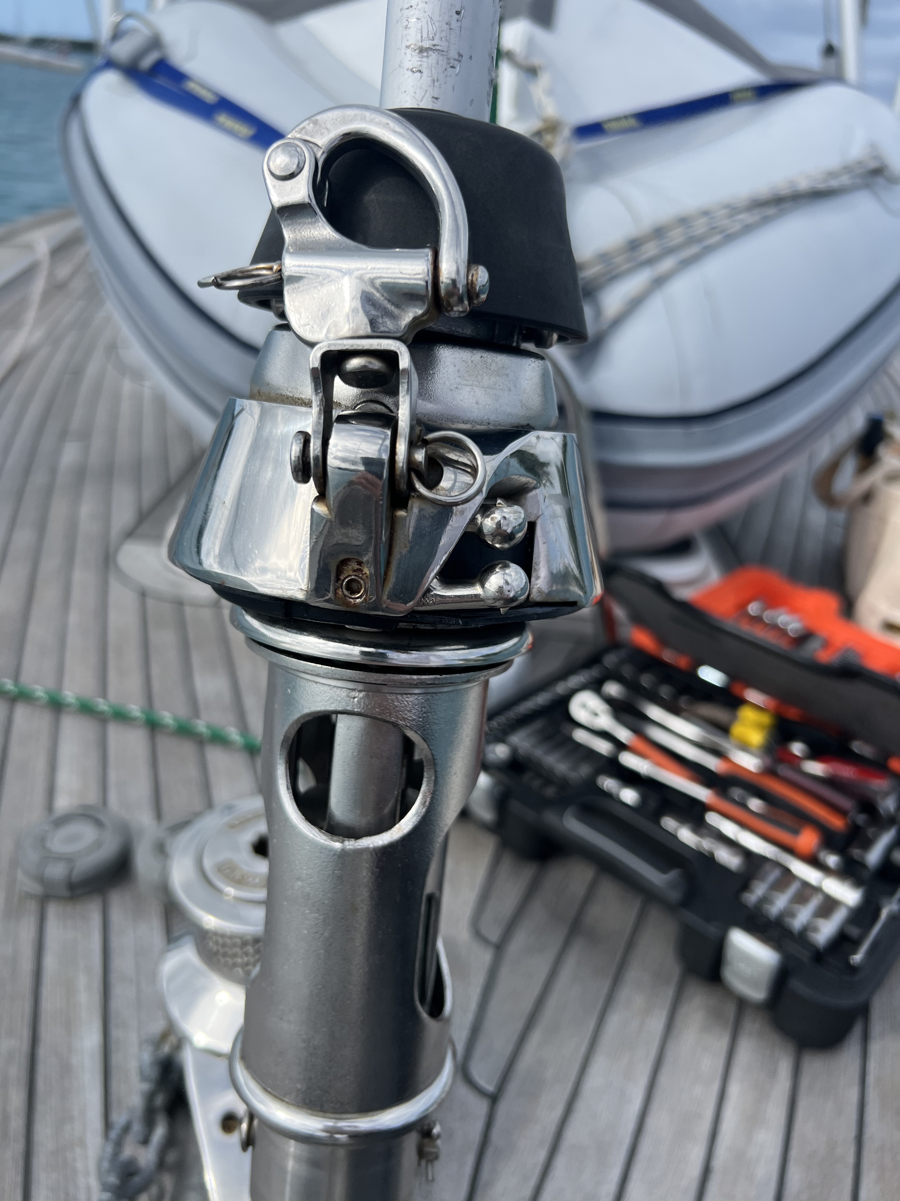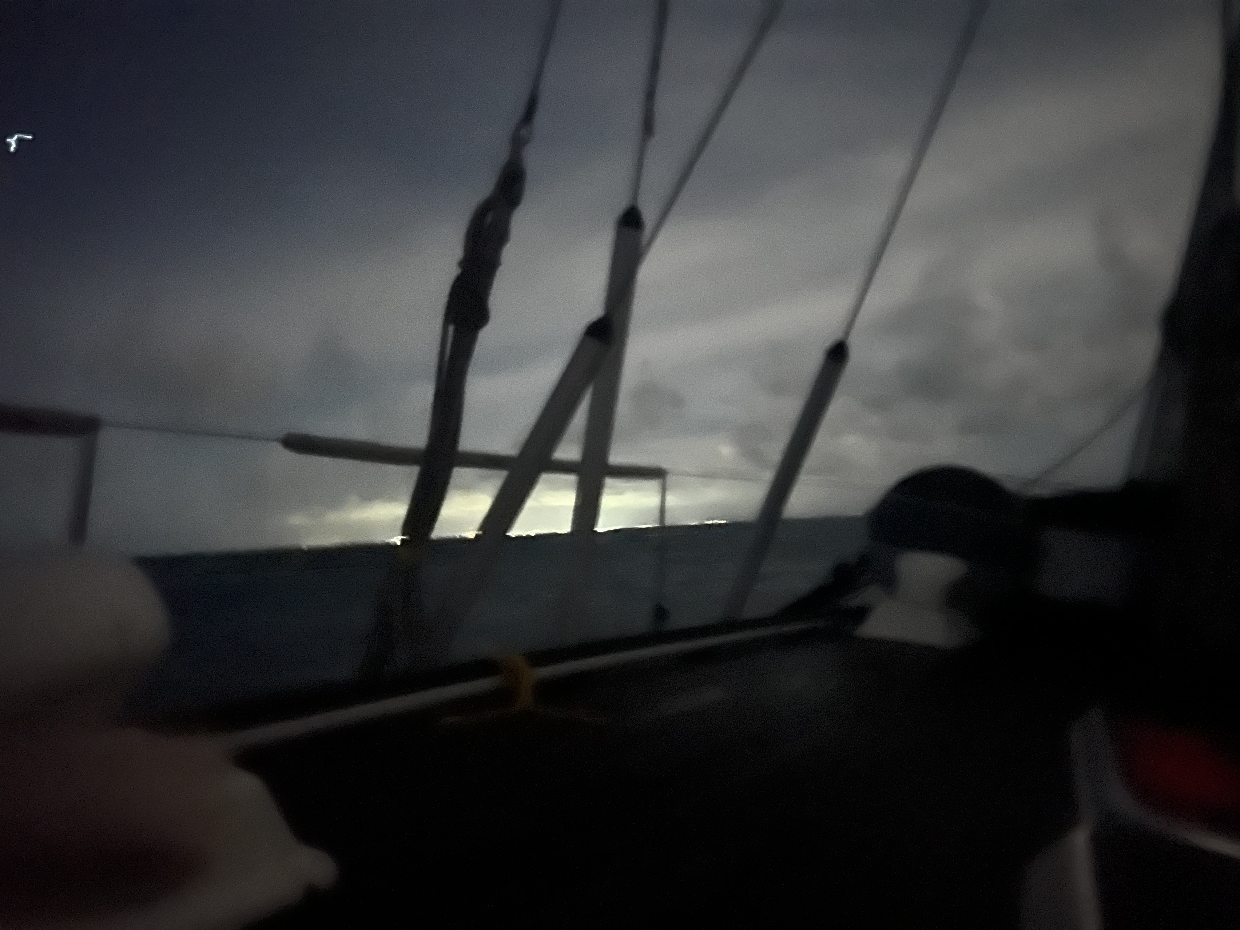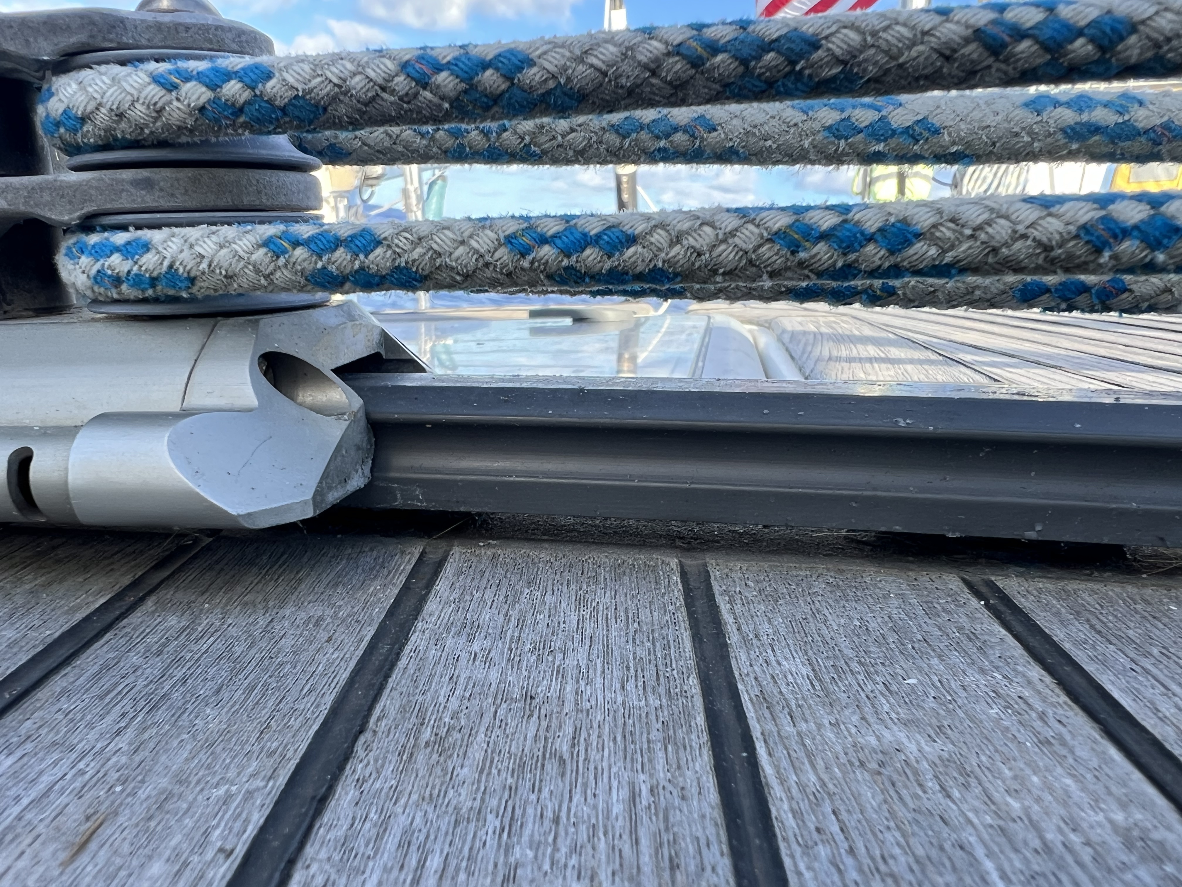 We all got our sea legs back, and we got back into the rhythym of the watch schedule. Well, remember that accidental gybe prior to Bermuda? It reared its ugly head. I was sitting behind the helm kinda of relaxing but still had my head on a swivel as we were navigating and getting our senses about us. While on a port tack, I happened to see the traveler track lifting off the deck. It was the perfect timing with the light shining from behind.