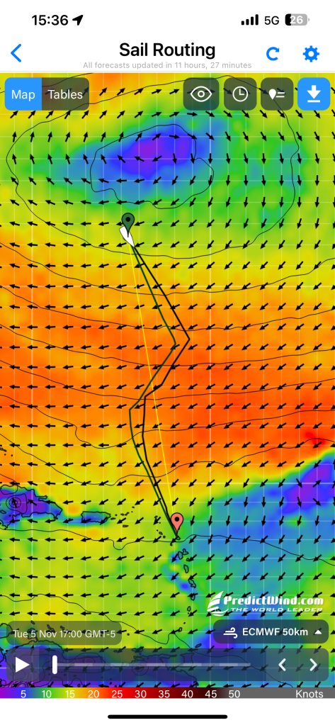 Overall, I thought it was also convenient to be sailing with the Salty Dawgs and to have the app at our fingertips to keep track of nearby boats. Although weather input from Chris Parker was helpful, I found that supplementing Chris’ guidance with personal use of XyGrib, LuckGrib and PredictWind where I drew my own conclusions gave much more confidence in critical navigation decisions.