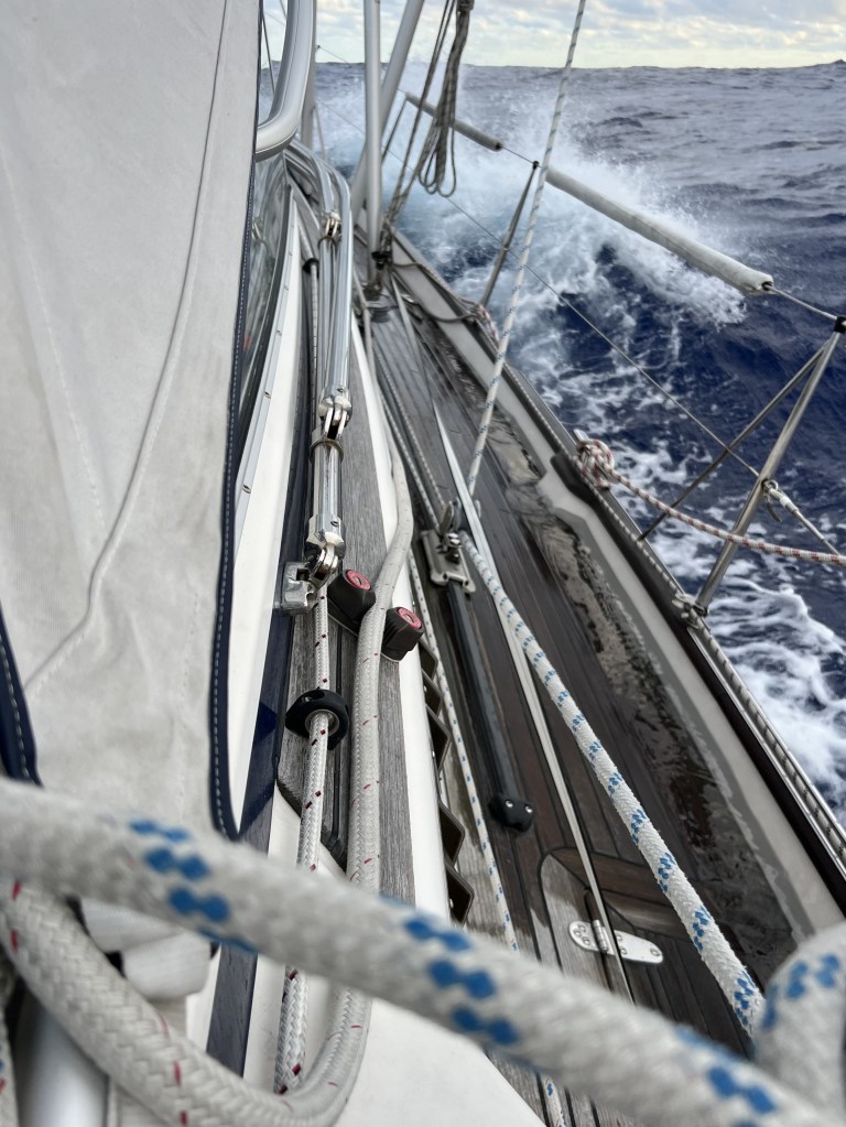 The first few days we sailed in reefed conditions. We caught up with a pod of dolphins which was probably one of the trip highlights. We tried to dial into Chris Parker daily broadcasts and also Salty Dawg meetings on Starlink. The entire trip was a bit plagued by not being able to dial into the calls or the calls happening without our knowing about them. The Salty Dawg iPhone app proved to be the best pieces of technology that we used and liked (I didn’t have it on the trip in 2023).