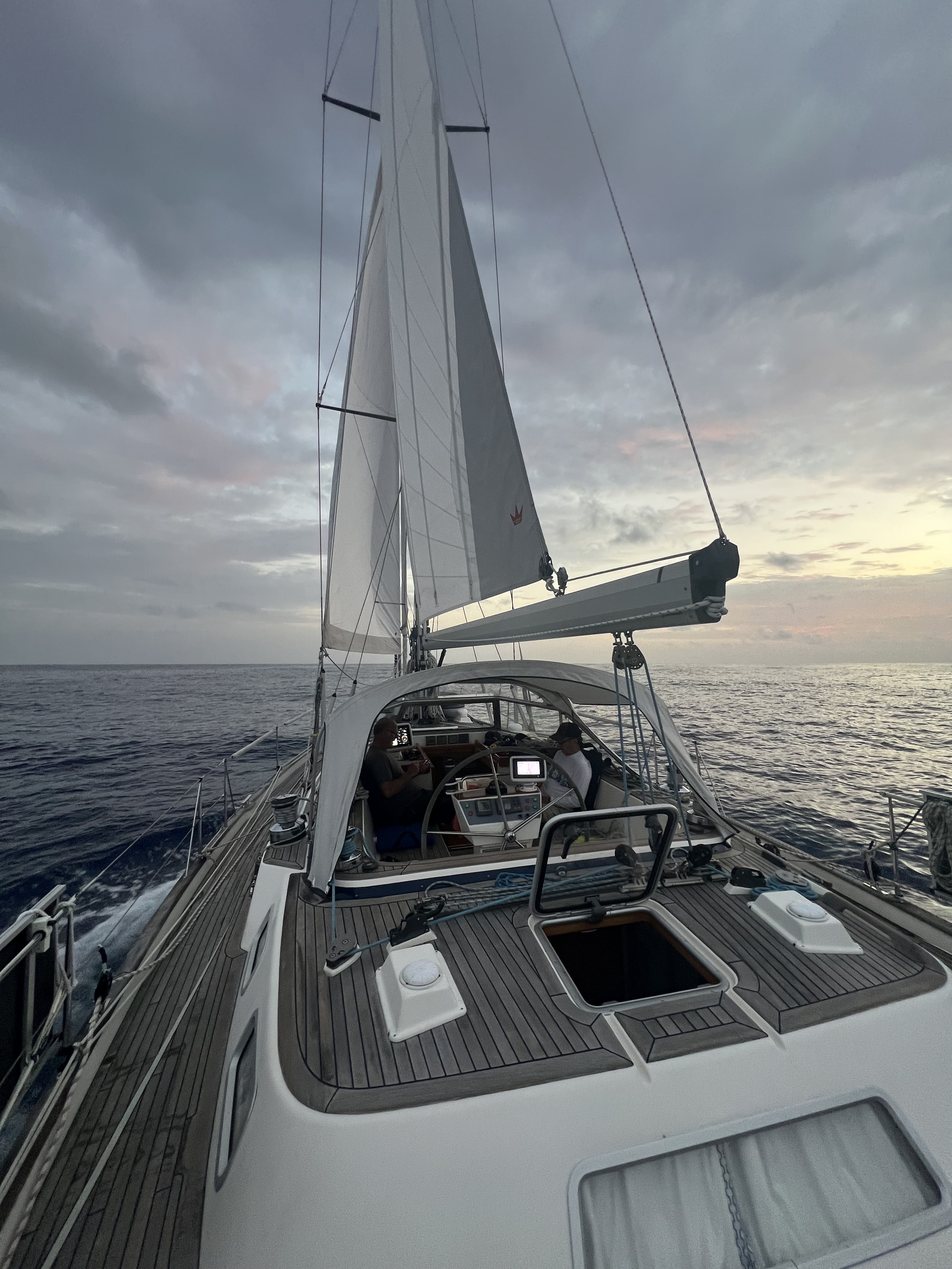 The trip was about 1600 nautical miles and took about 9 days 15 hours. We saw winds not exceeding about 30 knots and waves not bigger than 10 feet; those conditions were not long lived. Although I know the boat could easily handle quite a bit heavier sea state, it was nice to stop in Bermuda. I definitely want to return there some day. The Hallberg-Rassy 48 was definitely a different boat from the Oyster 62.5 (2023 trip), but I feel like the boats handled the weather and sea state with similar confidence.