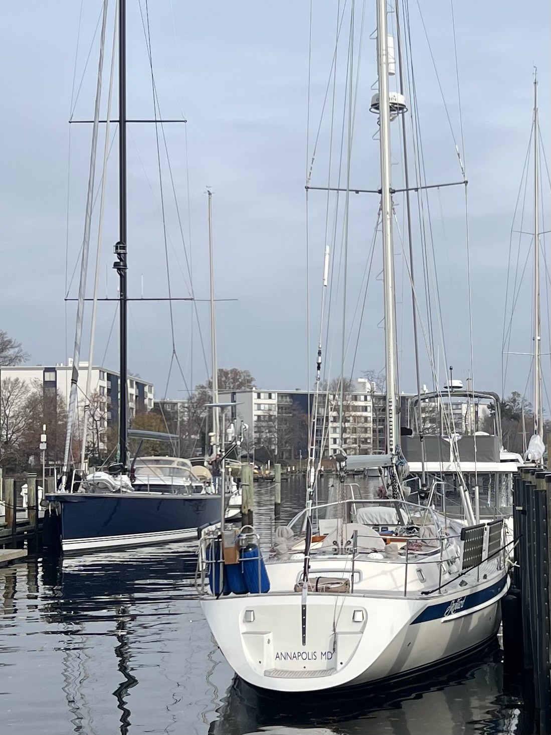 We glided smoothly onto the fuel dock at Annapolis Landing to top off the tank with about 20 gallons of diesel. The very experienced worker there gave me one of those sailor-to-sailor stares and a hand signal to cut the engine once he had control of the dock spring line. That was comforting. After we filled up, we idled up Back Creek and backed into the slot. The team there handled us smoothly with no fuss. We even received a couple of “welcome back!” shout outs from the crew there who recognize us and the boat.