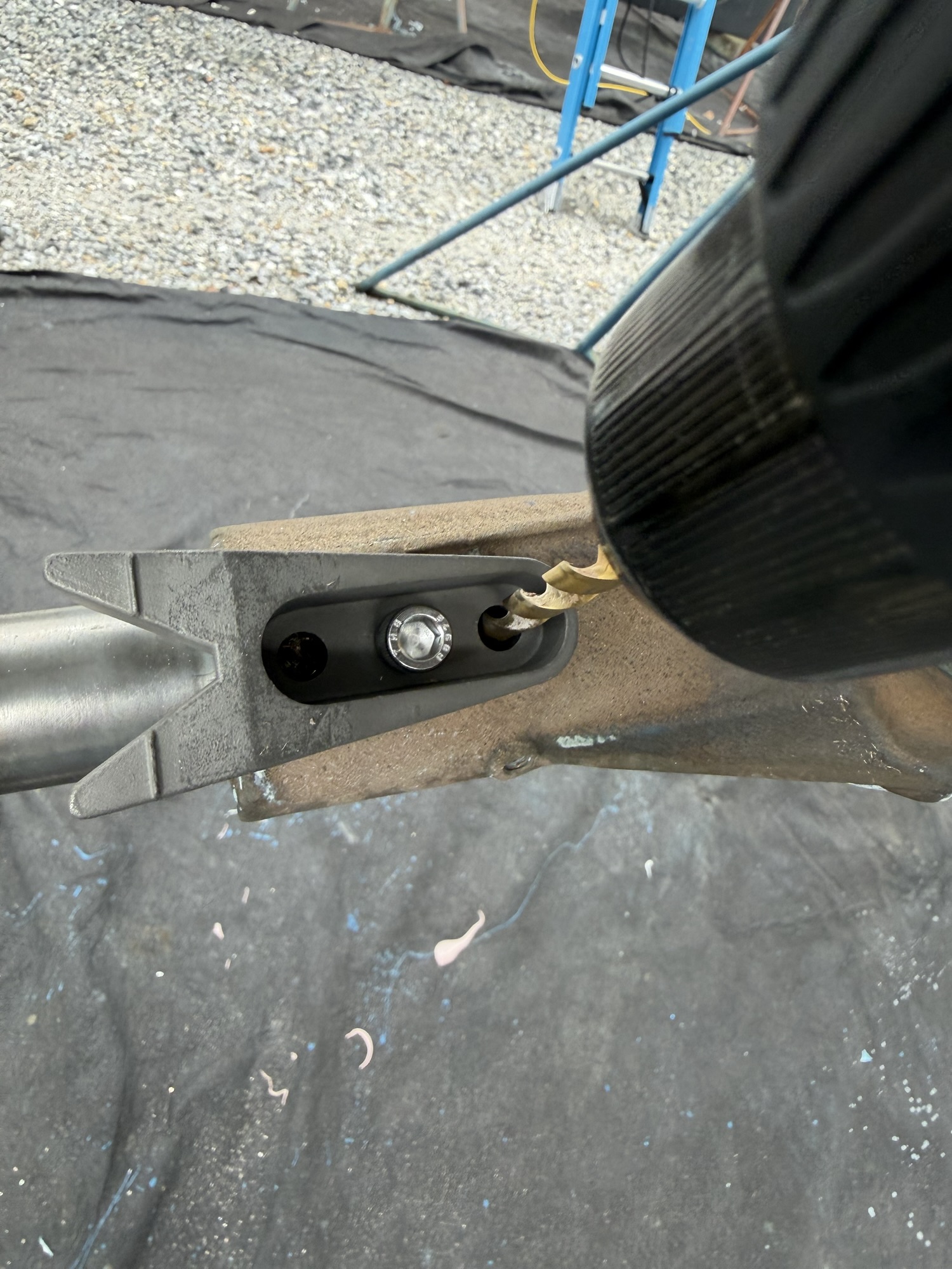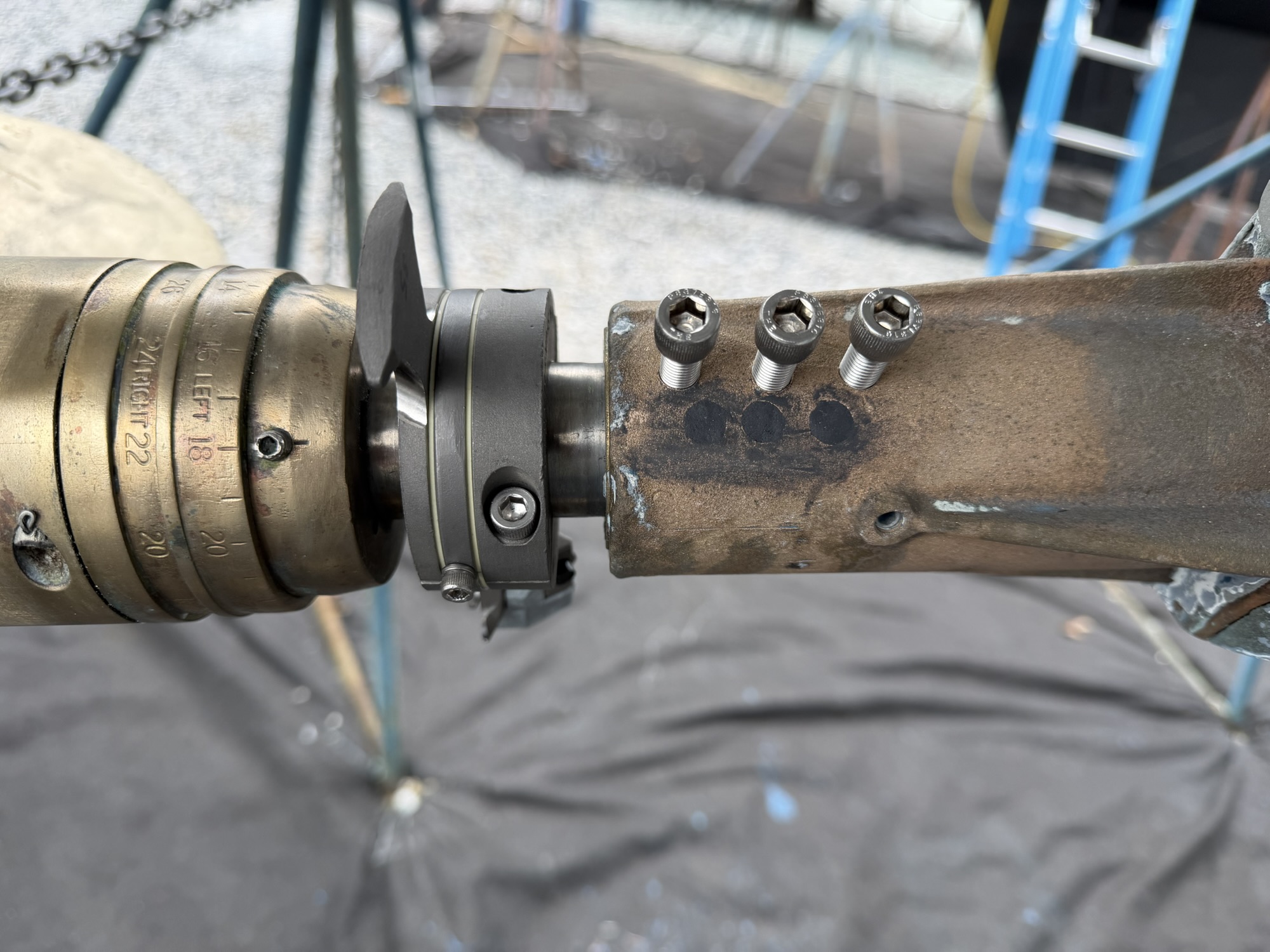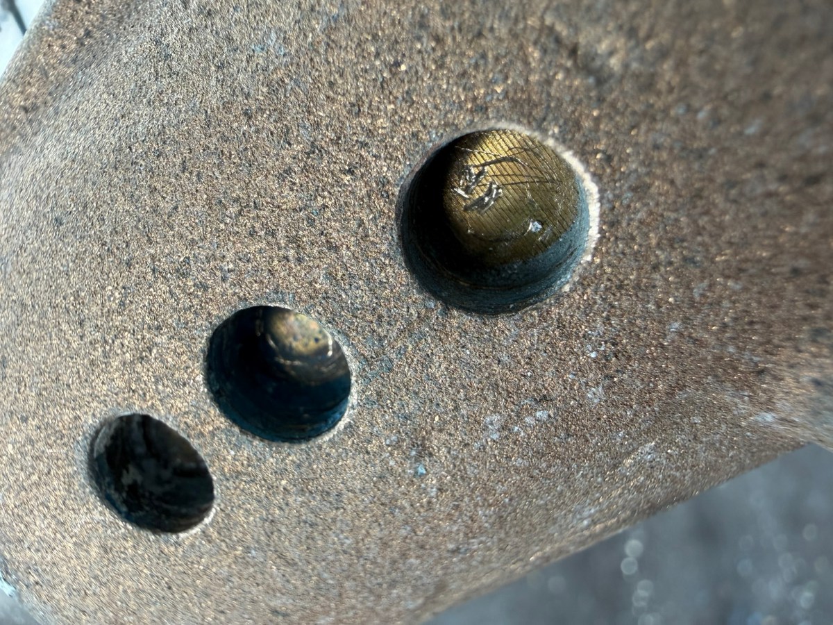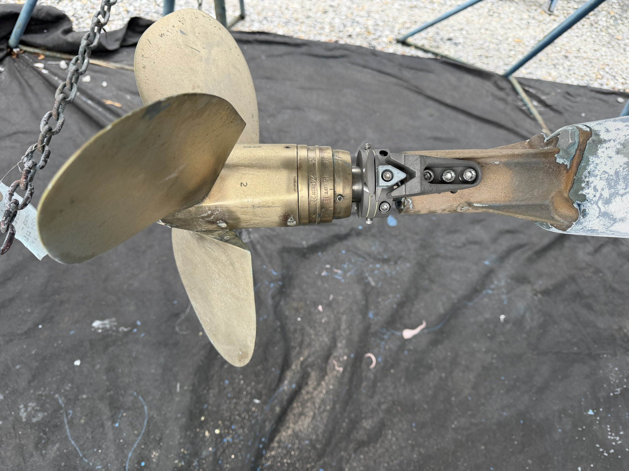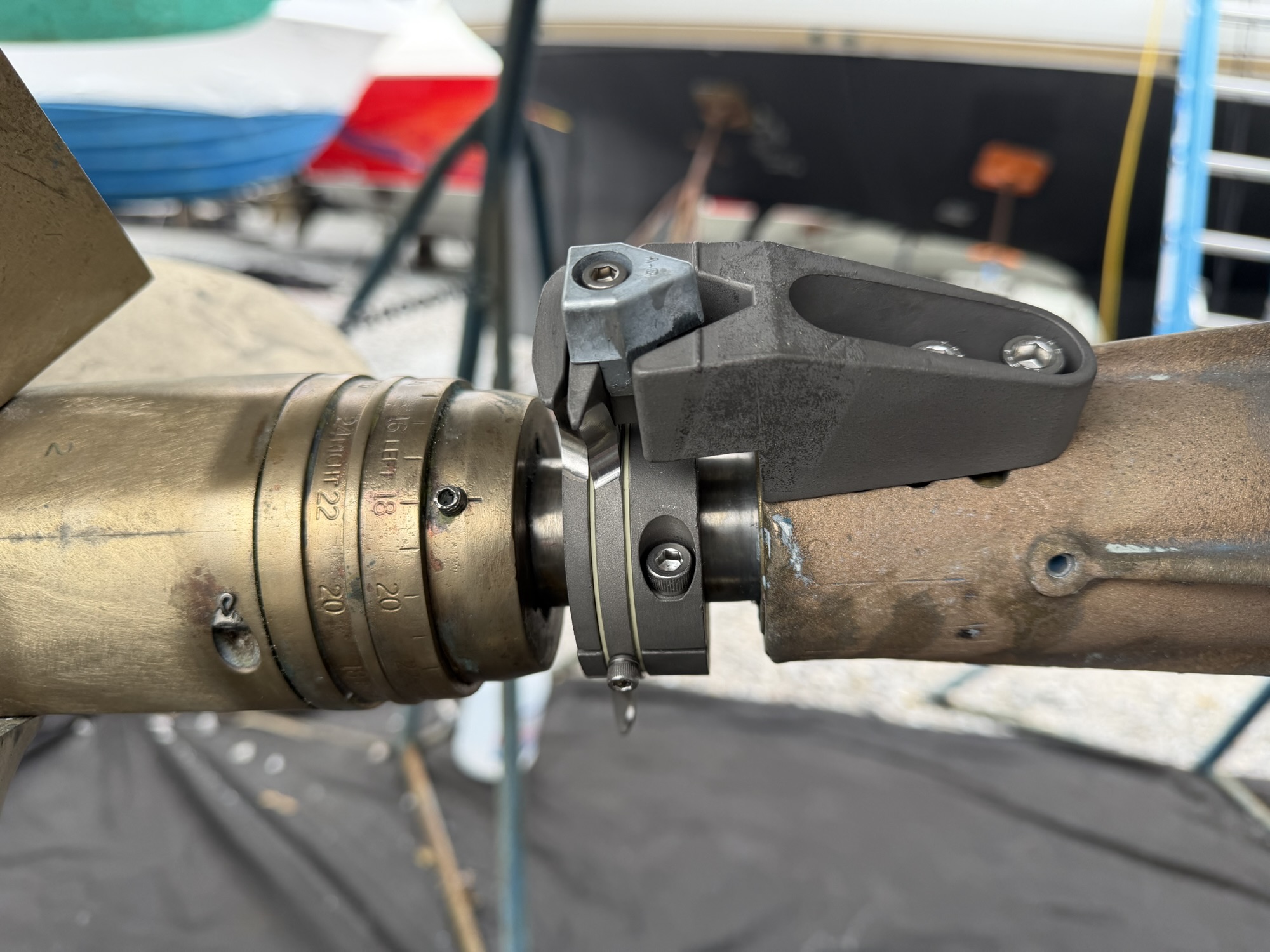 I filled the original holes with JB Weld Steel Stick. The final installation looked great, and I had this whole unit installed in just a couple of hours under the boat on stands in the yard. This installation will not allow me to use a shaft zinc, and so therefore, we anticipate having the change the propeller zinc / anode more often. Several boats at Bert Jabins Yacht Yard use the Spurs system, and our installation looks identical to those. One thing I’ll note is that most of those installations seem to be lacking the anode and the noise dampening elastomers on the stationary blade. That will be something for us to watch out for.