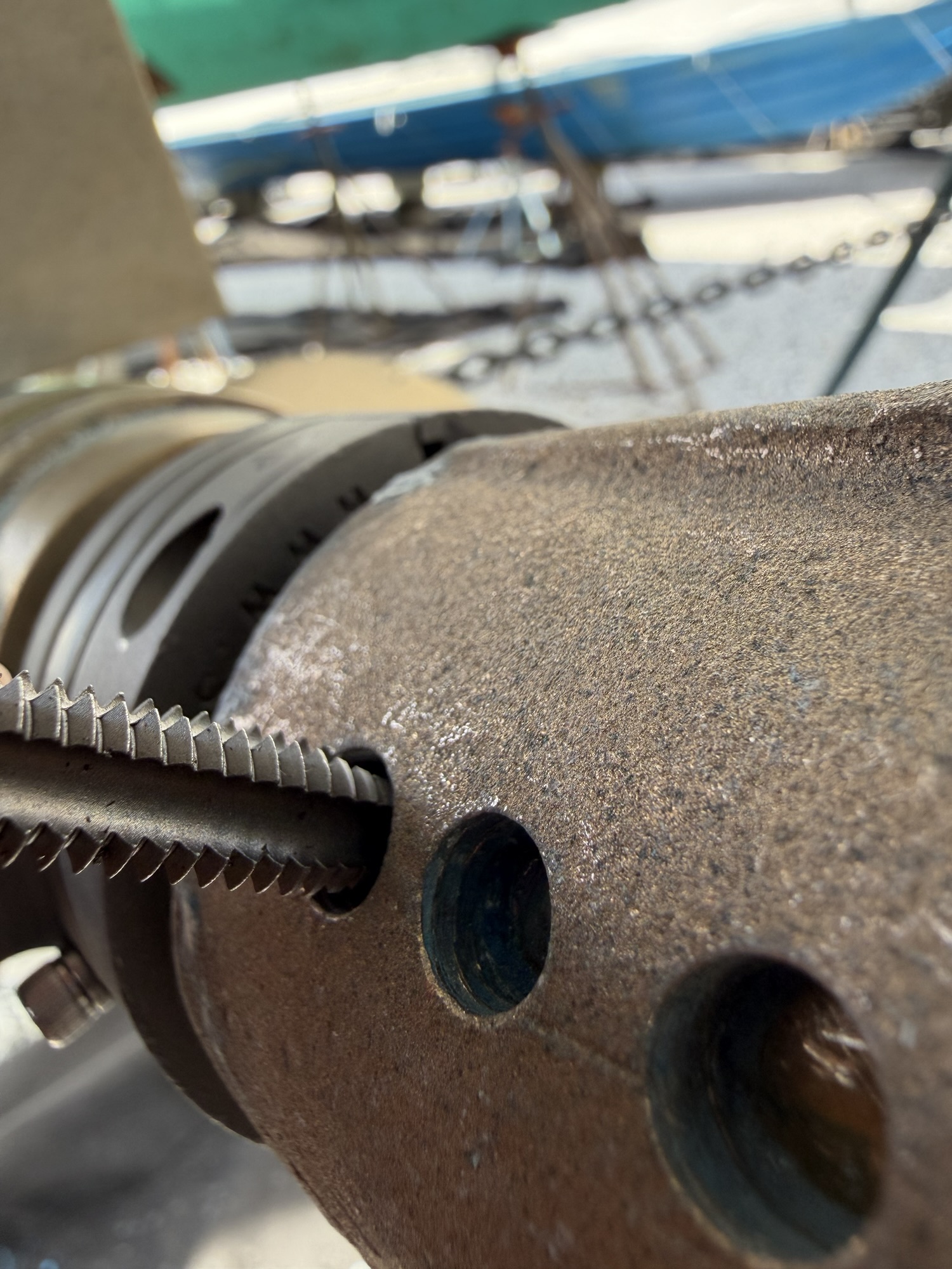It was immediately obvious that the Holding Block would not simply bolt up to the bronze bearing housing given the size and pattern of the holes. Something that I didn’t contemplate before starting this was that the thickness of the housing was around 5-7 mm. When I received the package from Spurs, the hex head bolts provided were of 5/16-18 which means 18 threads per inch – a relatively coarse thread for such a short depth to secure the Holding Block to the housing. Furthermore, my rusty but trusty Craftsman set of taps had a standard taper design, which meant the correct diameter tap wouldn’t be effective on such a short depth hole. Re-engineering was necessary.