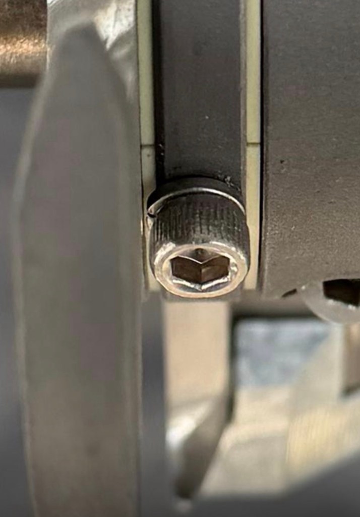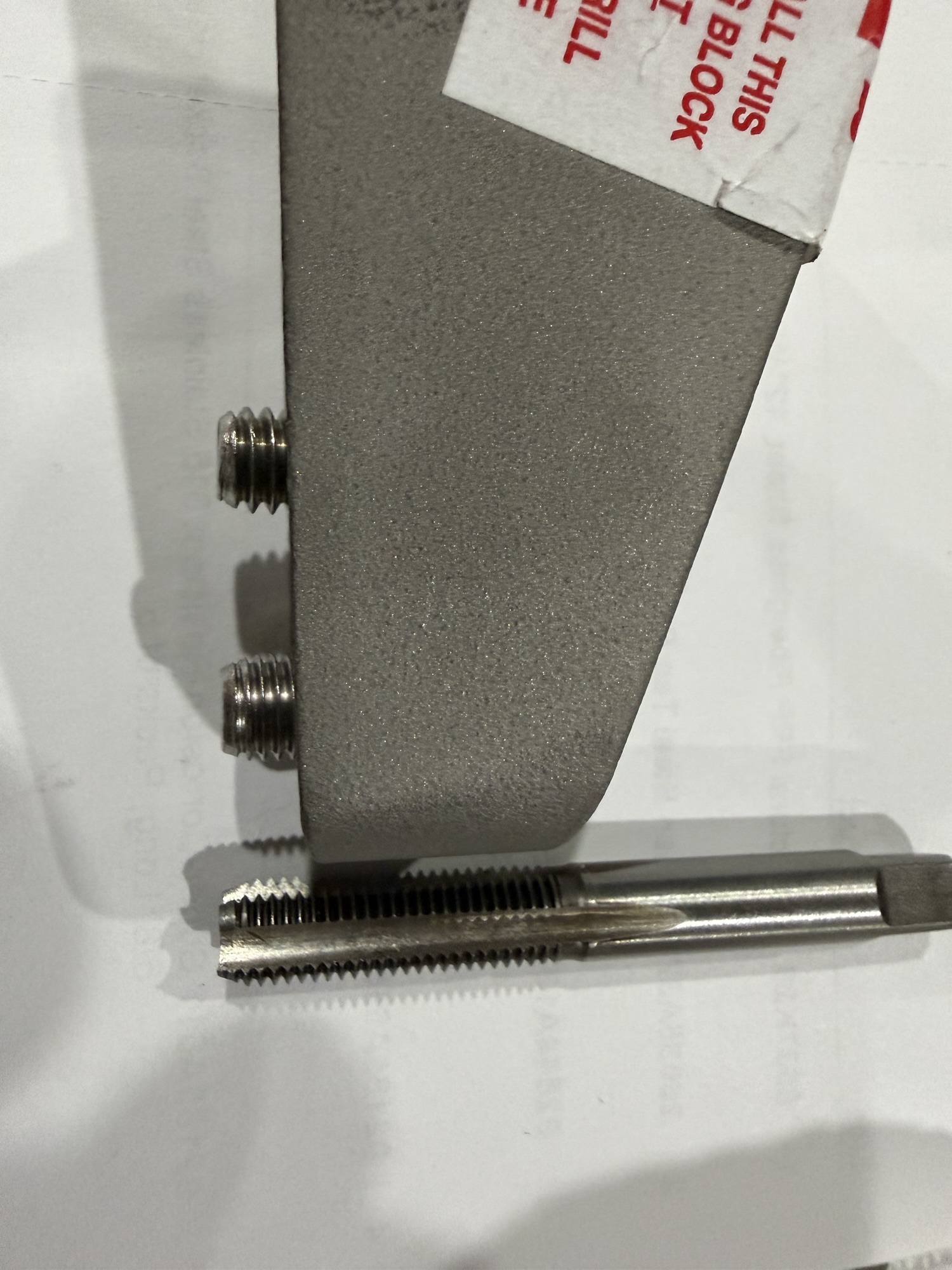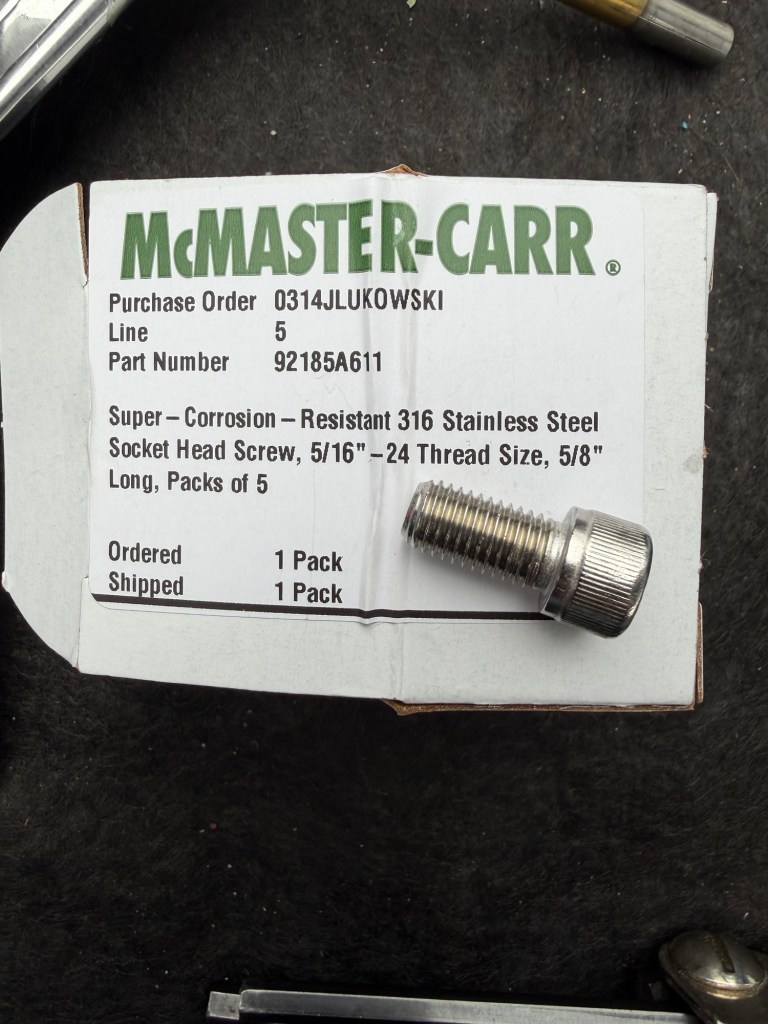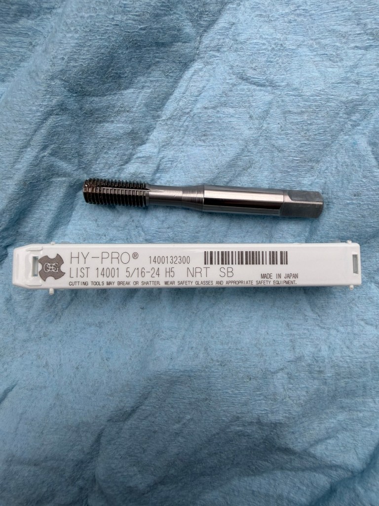 My plan was to source new socket head screws with finer thread pitch 5/16-24. I used 5/8″ long and 316 stainless steel screws even though Spurs claims the original screws are 304 staninless steel. They claim 304 is a softer metal compared to the Holding Block and will “break” first in the event of something getting lodged into the cutter and requiring excessive breaking force. I also sourced a high quality 5/16-24 bottom tap; I purchased 3 different ones and used this one from HY-PRO which had to least amount of starting taper. You can see that the 24 threads per inch (lower in the picture) give an increased amount of surface area and therefore holding force compared to the 18 threads per inch screw (upper in the picture).