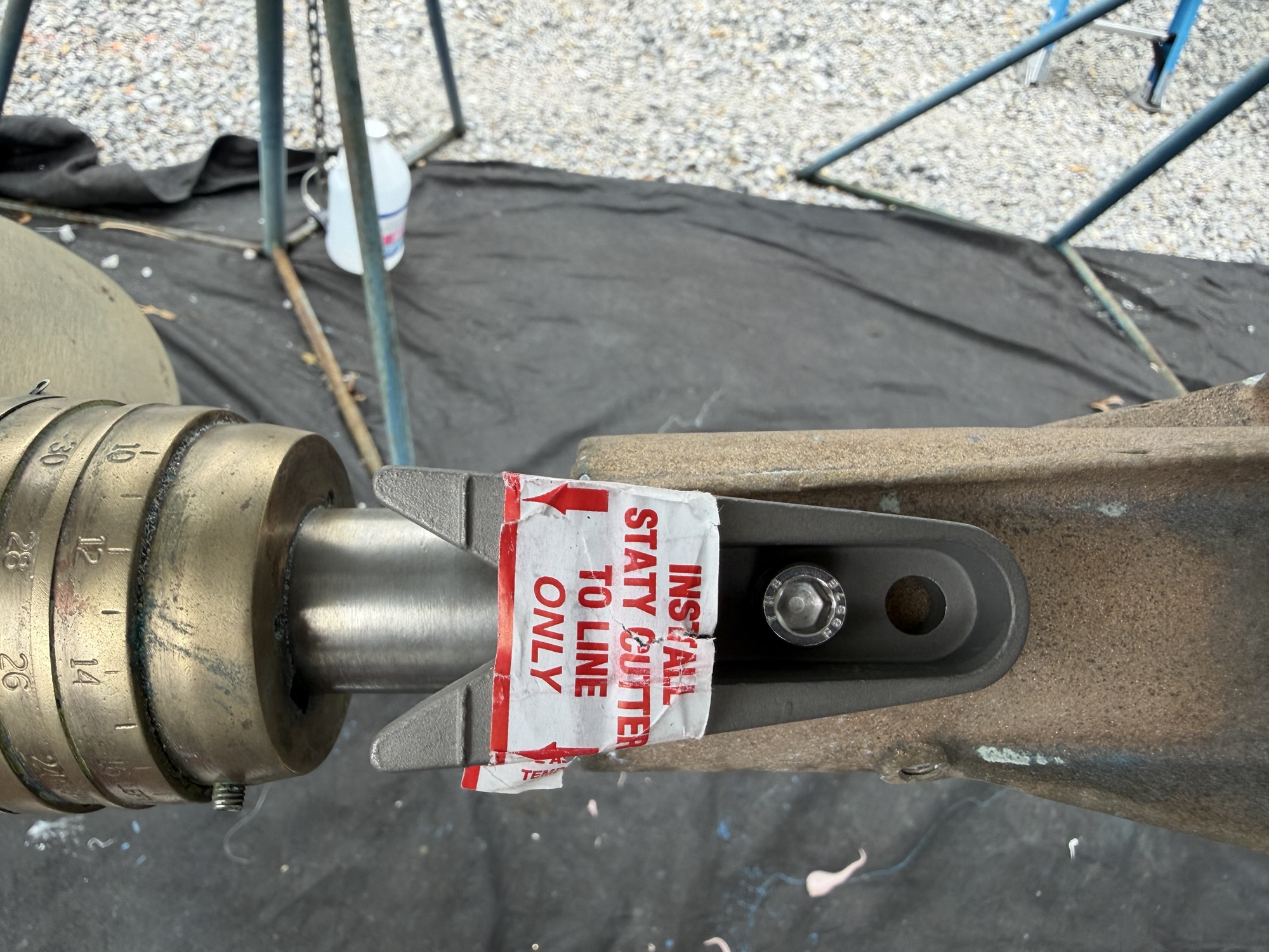 From the research I did, I was determined to install a Spurs rope cutter. I mistakenly thought that the three (3) pre-drilled holes in the bronze bearing housing match up with the Spurs system. These hold are all around 8-9 mm in diameter and seemed to have an uneven spacing between them. Spurs Marine, based in Florida, has been very easy to order from online, and talk with on the phone. I provided the following measurements for Skyward: