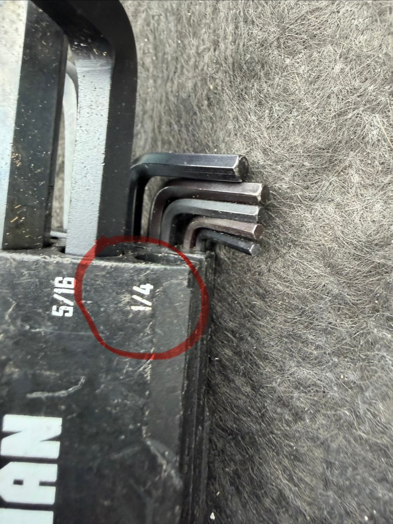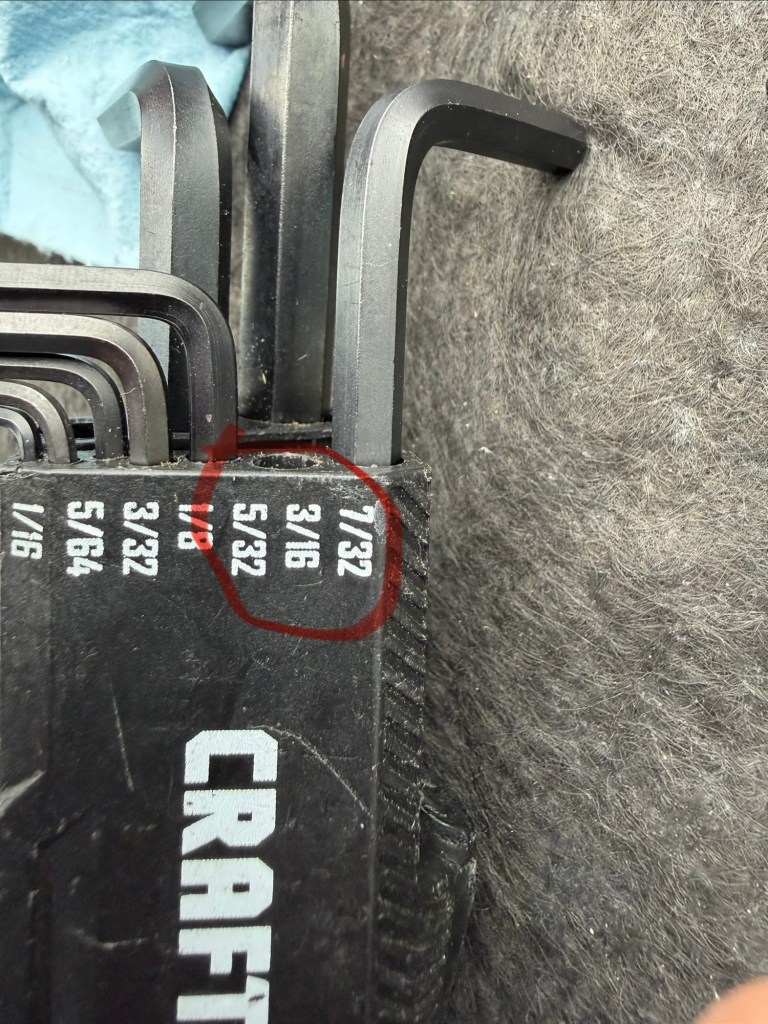 Toold that were required to do this job include a 9/64″, 3/16″ and 1/4″ hex as well as a 9/32″ drill for pre-drilling the new holdes. After I drilled the new holes, I carefully blew them down with air from a can to remove all debris. The 9/64″ hex is a MUST have to tighten the stationary blade.